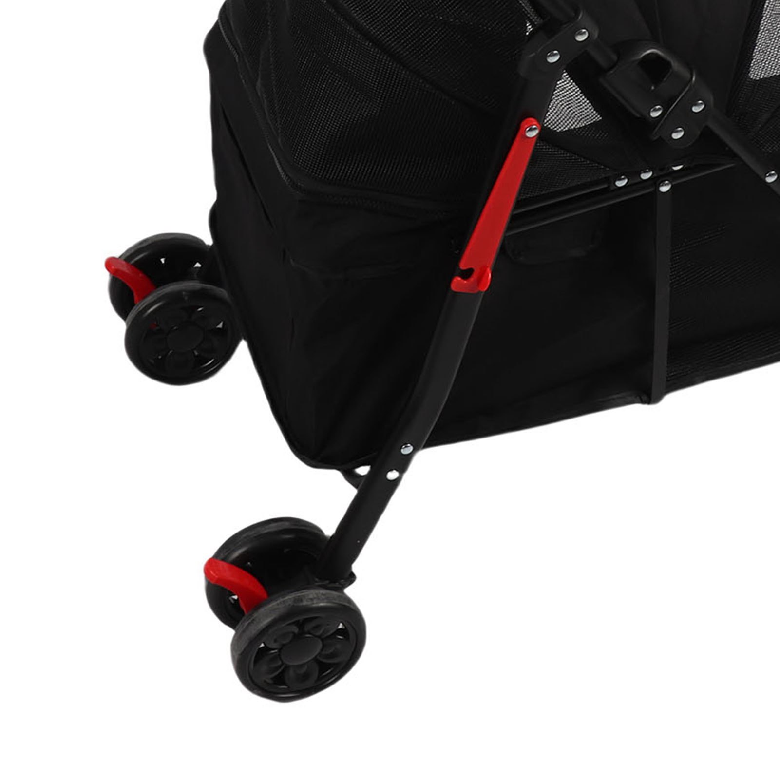 3. 4 колеса: завдяки 4 міцним колесам із амортизацією ця коляска гарантує плавну подорож. Пружинні колеса мінімізують нерівності, а задні колеса оснащено безпечною гальмівною системою для запобігання небажаному руху.