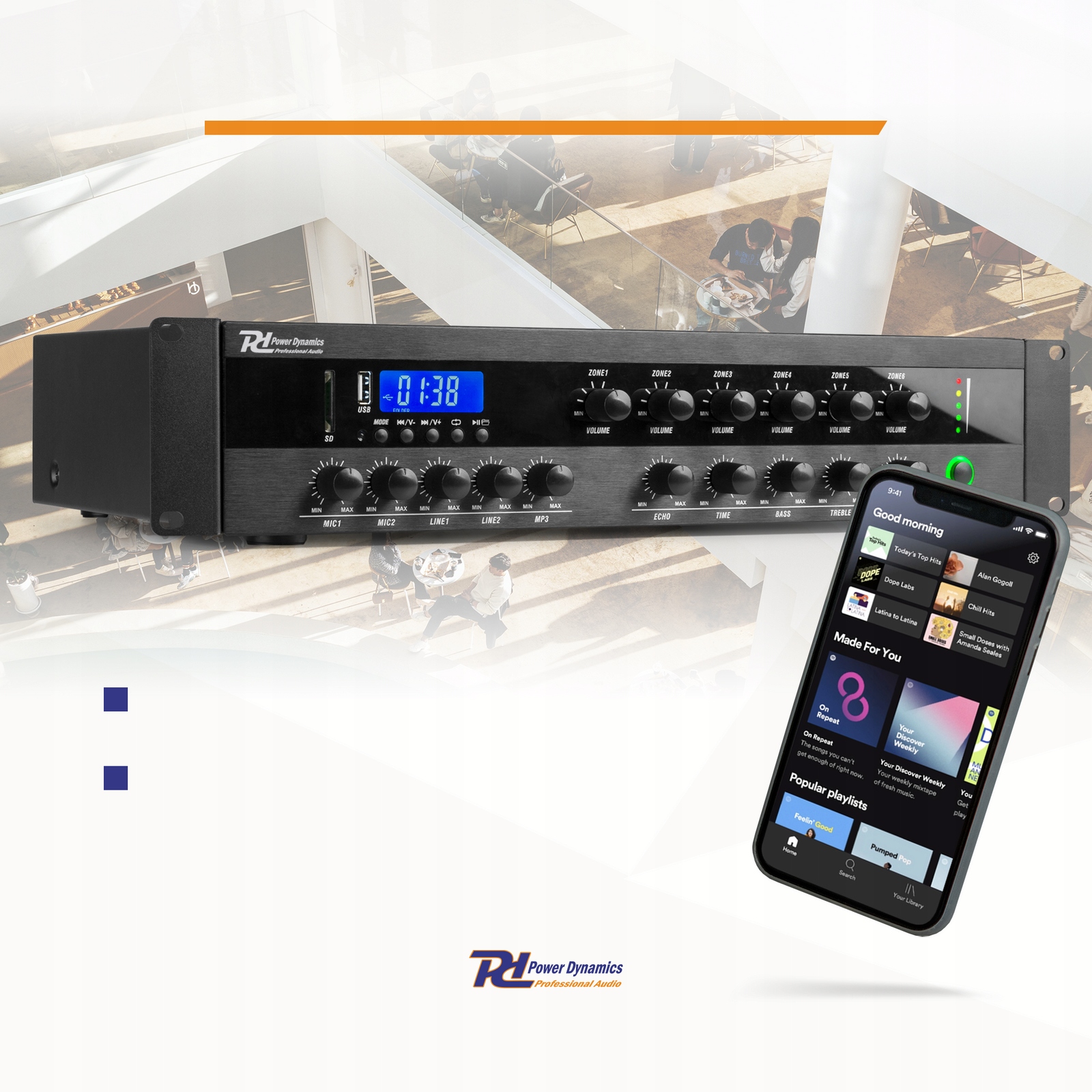 Ефективний, 6-струнний підсилювач змішування потужністю 500 Вт, дозволяє одночасно керувати багатьма місцями з індивідуальним контролем обсягу. Побудований -in MP3 -програвач (USB/SD), FM Radio та Bluetooth роблять його універсальним центром управління звуком. Підтримує як 100 В, так і низькі -імпедансні системи (4/8/16 Ом).