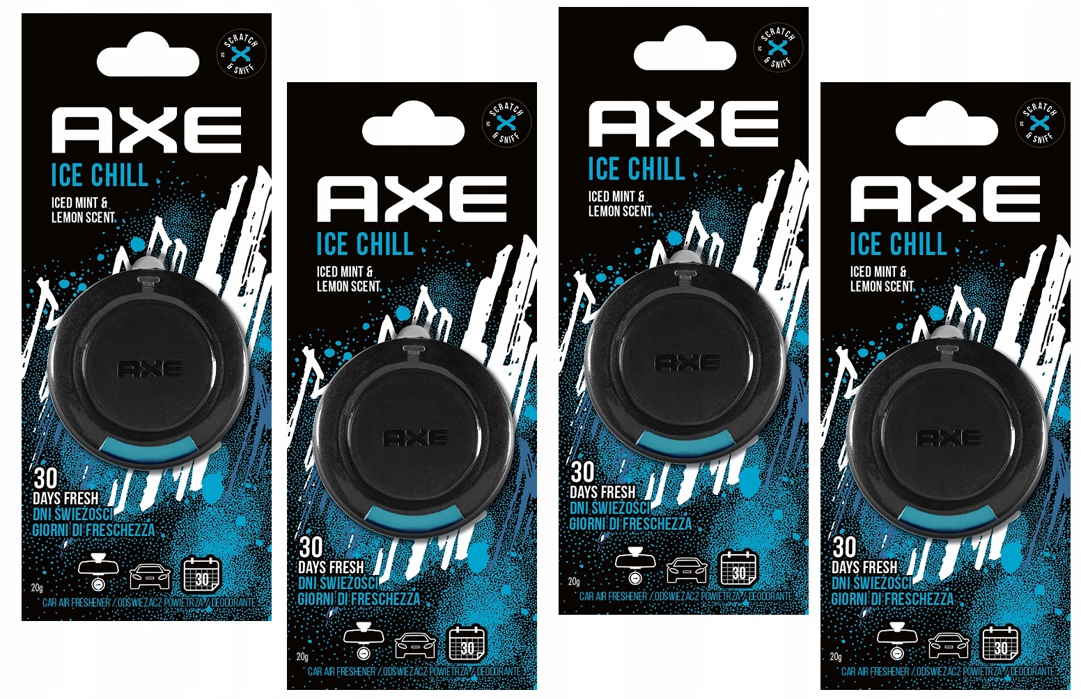 Автомобільні ароматизатори гарантують роботу до 30 днів. Ефективна доза непомітного аромату для вашого автомобіля. Нехай салон автомобіля чудово пахне цілий день. Ароматизатори AXE дозволяють контролювати свіжість у вашому автомобілі, де б ви не були. З ароматом Ice Chill.