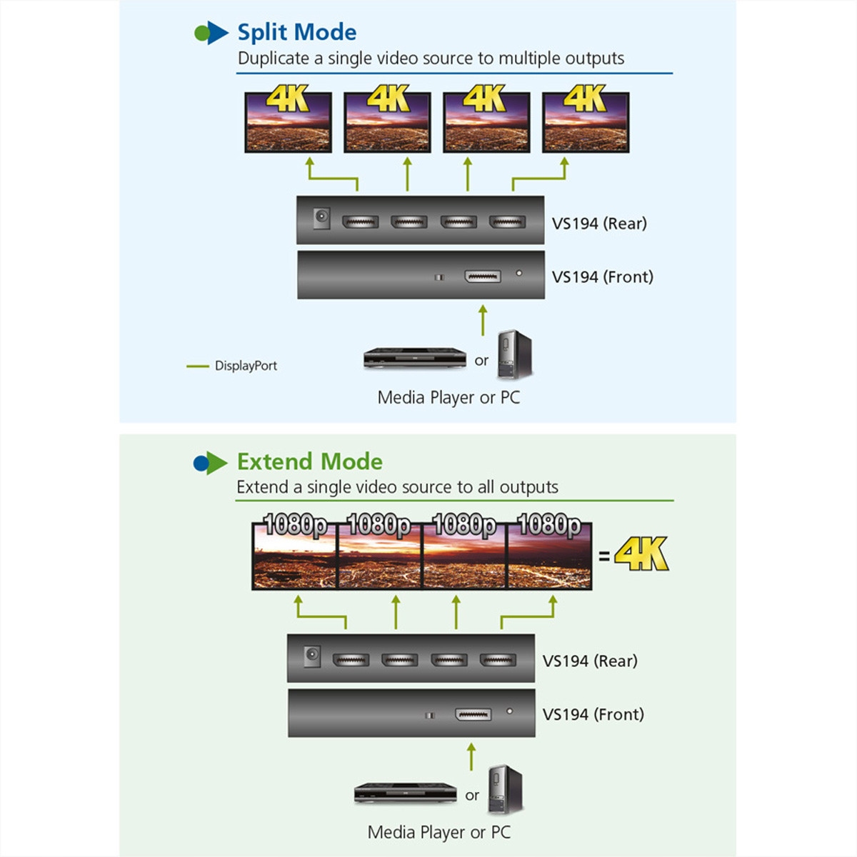 2-портовий розгалужувач 4K DisplayPort VS194 є ідеальним рішенням для тих, хто хоче надіслати одне джерело відео високої роздільної здатності DisplayPort на чотири монітори DisplayPort. VS194 може не тільки розділяти аудіо/відеосигнал DisplayPort, але й поширювати його на чотири монітори DisplayPort, що ідеально підходить для програм із кількома моніторами. VS194 сумісний з DisplayPort 1.2a і може підтримувати роздільну здатність до 4K при 60 Гц, що робить його ефективним і ідеальним для використання з усіма моніторами DisplayPort у додатках домашнього кінотеатру, а також у корпоративному та бізнес-середовищі. Освітня та комерційна потужність.