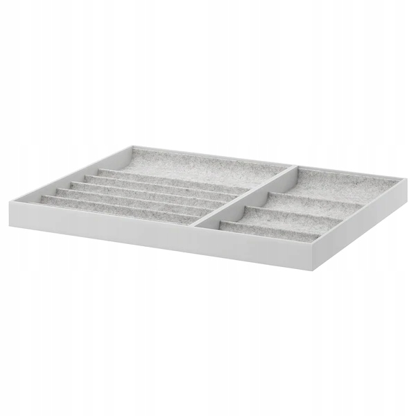 Ми пропонуємо композицію композиції для висувного лотка в елегантному світло -сірому кольорі, ідеально підходить для організації та зберігання сонцезахисних окулярів, годинників та інших аксесуарів. Завдяки використанню м'якого фетру ваші аксесуари будуть належним чином захищені та завжди на місці. Розміри вставки адаптуються до висувного компліменту полиці, що робить його чудовим рішенням для шаф -шаф.