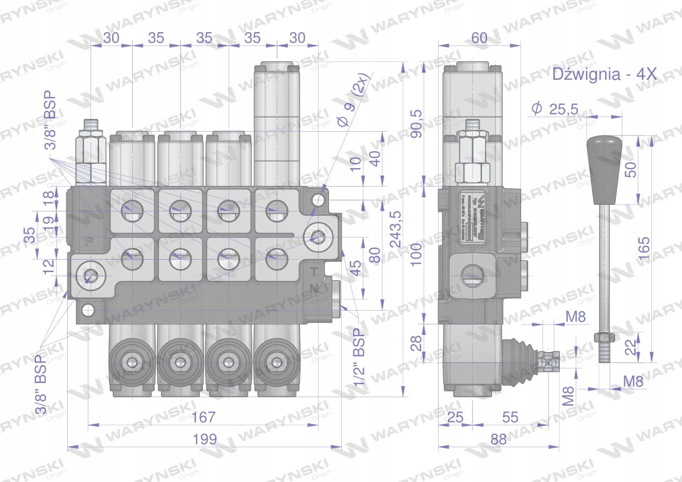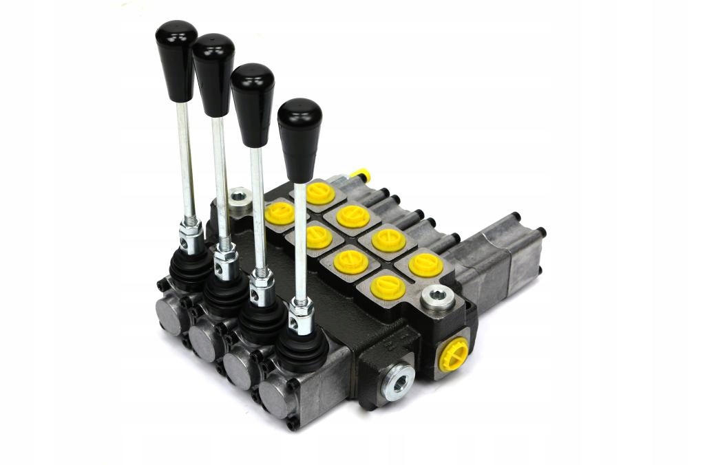 Гідророзподільник Waryński 4-секційний - моноблок з паралельною системою з нейтральним середнім положенням, керований 4 важелями. Одна секція: плаваюча (з засувкою).