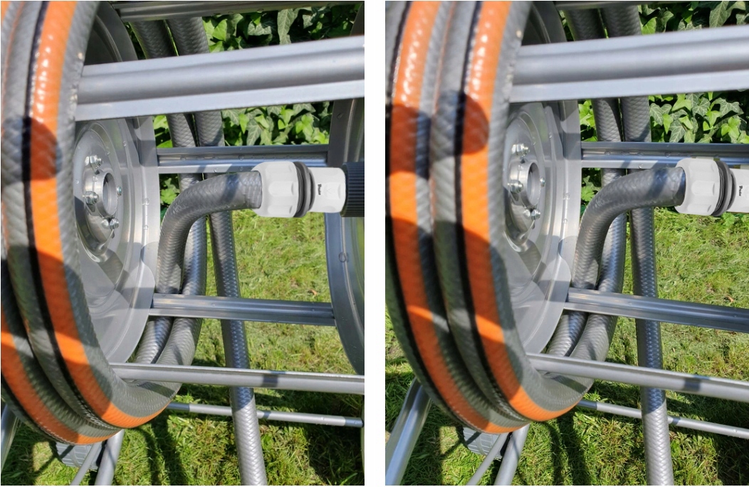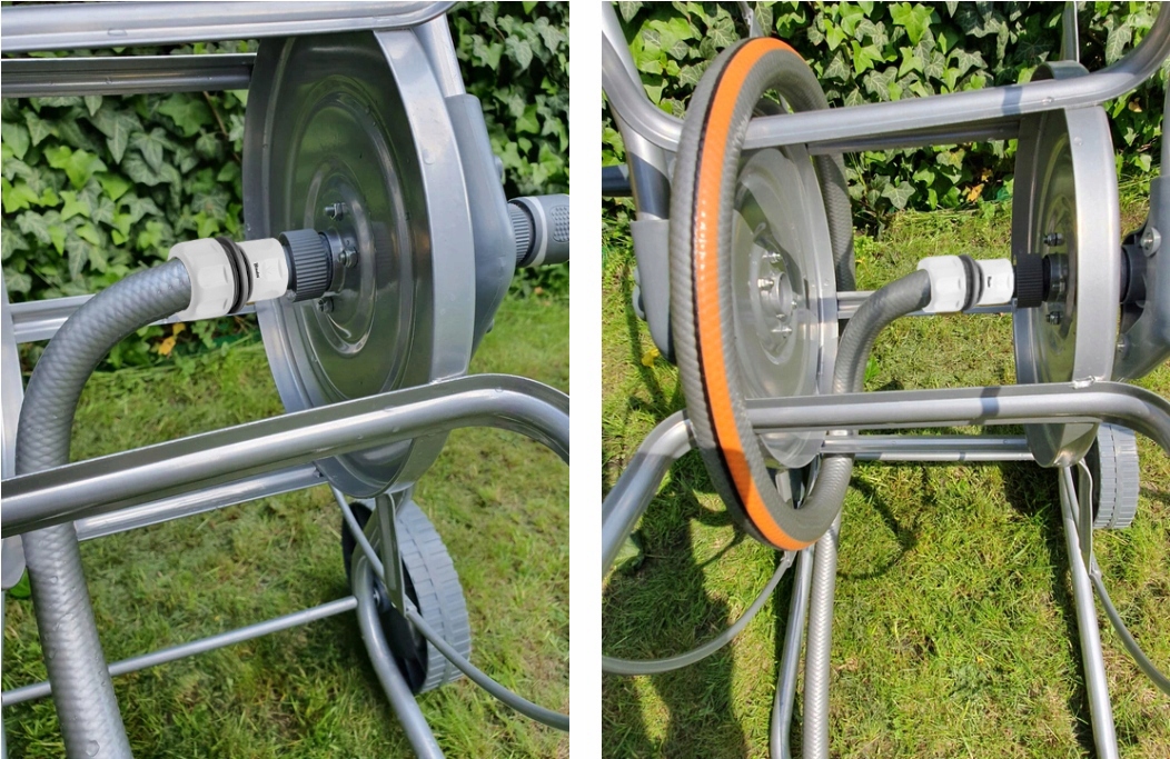 Примітка: шланг слід наповнити водою перед тим, як намотувати його на візок. Візок виготовлено з пофарбованої сталі. використовується в контакті з водою, і може з’явитися іржа. Тому рекомендується періодичне технічне обслуговування.