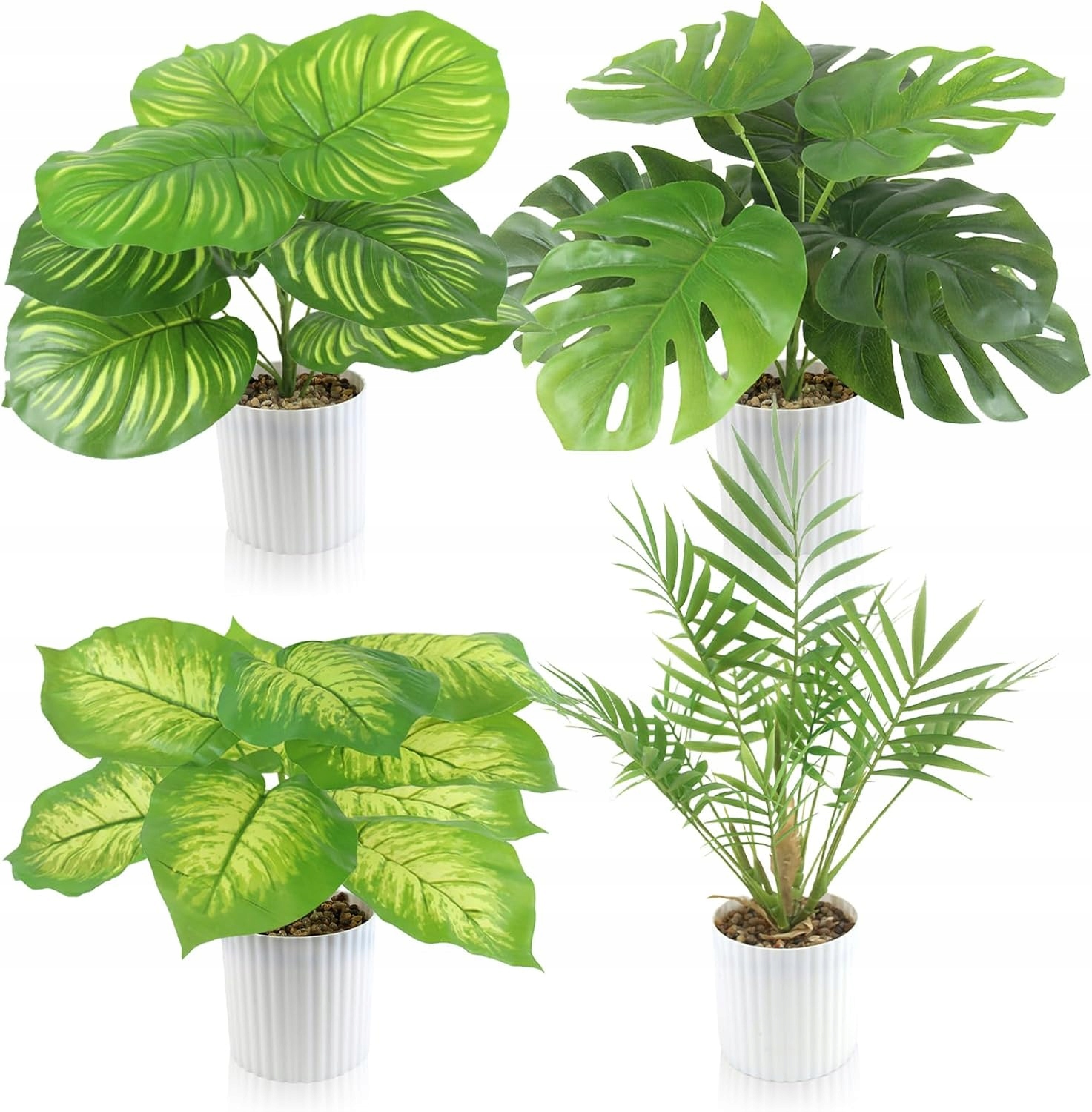 Внесіть частинку природи у свій інтер'єр без необхідності поливу та догляду! Набір з 4 штучних декоративних рослин у вигляді популярної монстери і пальмового листя - ідеальне рішення для людей, які цінують естетику зелені і водночас комфорт. Завдяки реалістичному виконанню рослини виглядають дуже природно, додаючи шарму будь-якій кімнаті - від вітальні та спальні до офісу чи ресторану.