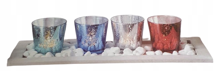 Зроблено зі скла, дерев’яна підставка з розмірами довжиною 40 см, ширина 14 см, біла декоративна галька, 4 ліхтарі з розміром: 7,5 х 7,5 см,