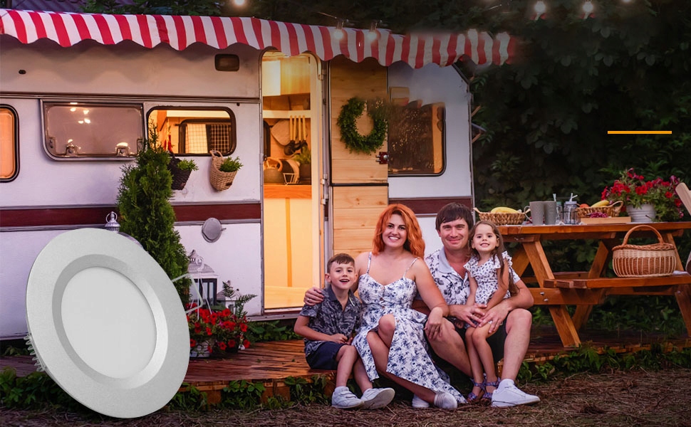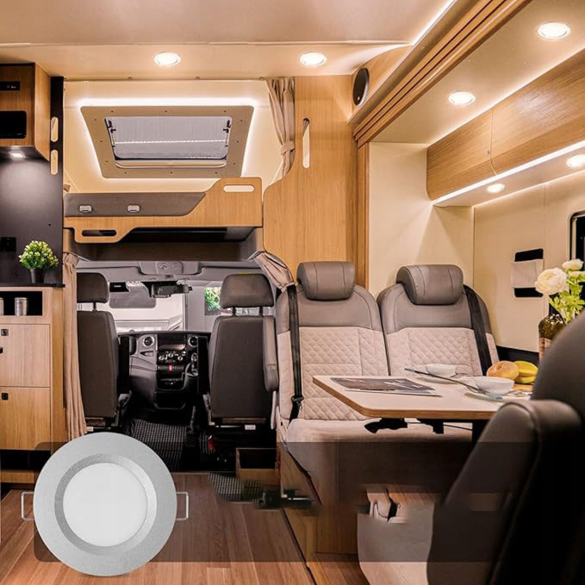 💡【Повний алюмінієвий корпус】 Світлодіодний корпус на 12 В виготовлений із суцільного алюмінію, який добре розсіює тепло. і антикорозійне покриття, що подовжує термін служби внутрішнього освітлення кемпера до понад 50 000 годин. Міцніші та вишуканіші, ніж інші традиційні пластикові стельові світильники для фургонів.