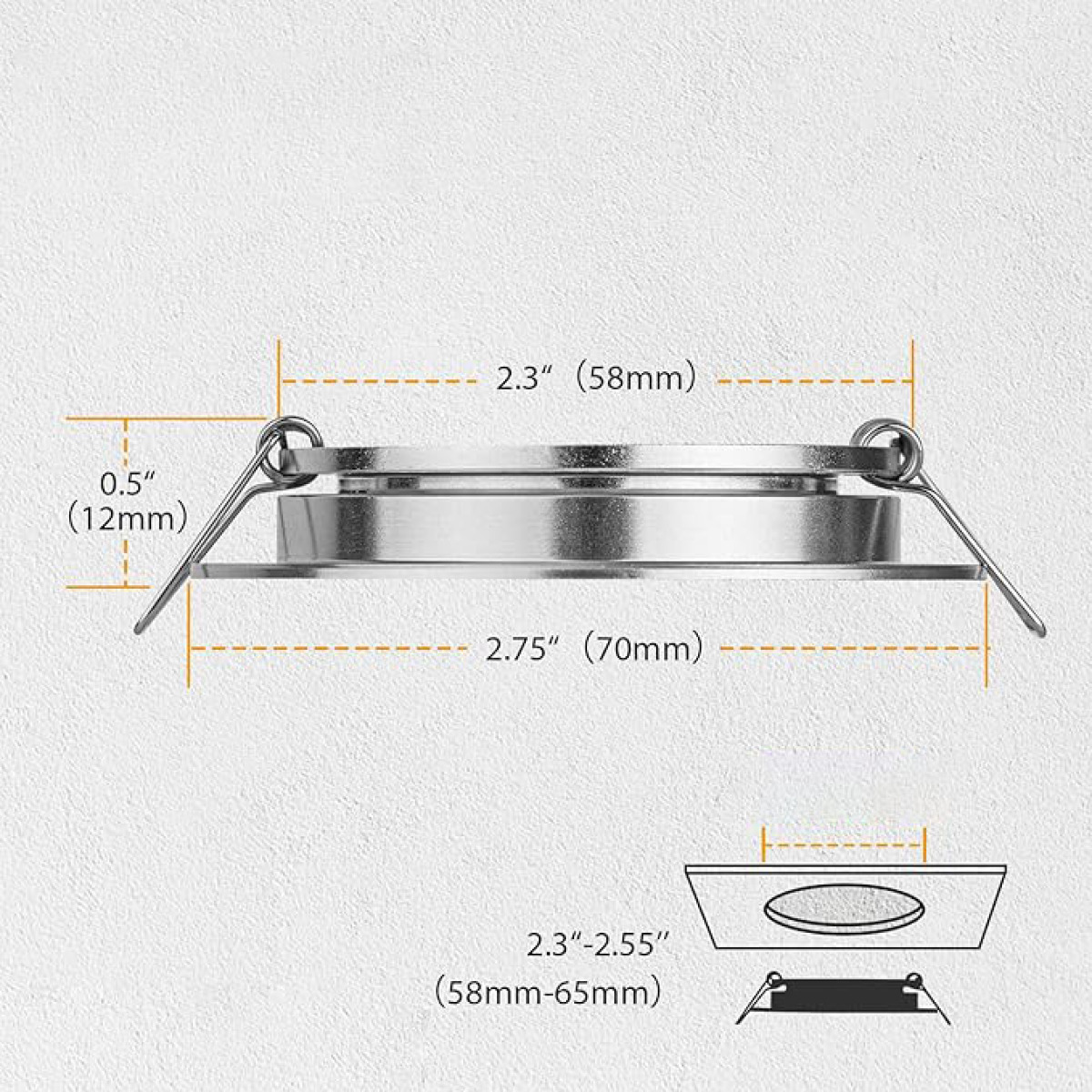 💡【Легко встановити】 Отвір 55- 60 мм, зовнішній діаметр 70 мм, монтажна глибина 12 мм, з’єднувальний кабель 15 см. І надійні, і прості в установці. Гвинти не потрібні, просто вставте лампу RV в отвір після підключення джерела живлення. Вишуканий сріблястий алюмінієвий корпус робить його більш гармонійним із декоративним оточенням.