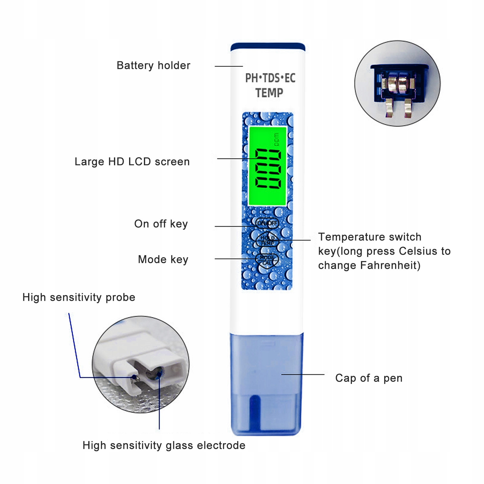 багатофункціональний та вдосконалений: професійний ТД, ЕК та рН -лічильник, 4 в 1 метр температури. Великий РК -дисплей для легшого читання та автоматичної функції блокування для легшого використання.