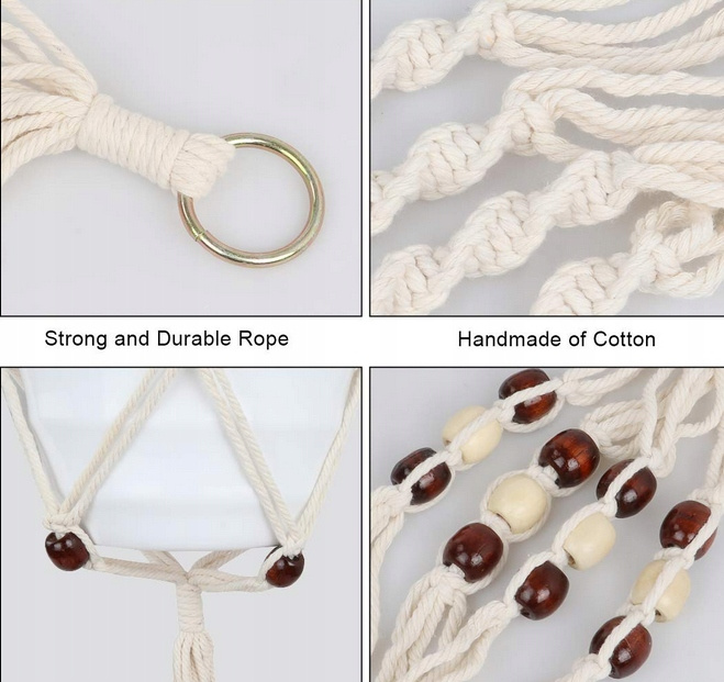 Набір із 4 вішалок для макраме виготовлено з високоякісної натуральної бавовни, що гарантує довговічність і непідвладний часу вигляд. Ідеально підходять для демонстрації ваших улюблених рослин, ці вішалки підходять як для внутрішнього, так і для зовнішнього використання, що робить їх універсальним доповненням до будь-якого простору. Ідеально підходять як подарунок для любителів рослин, вони поєднують практичність з елегантністю, підкреслюючи красу вашого дому, саду чи офісу.