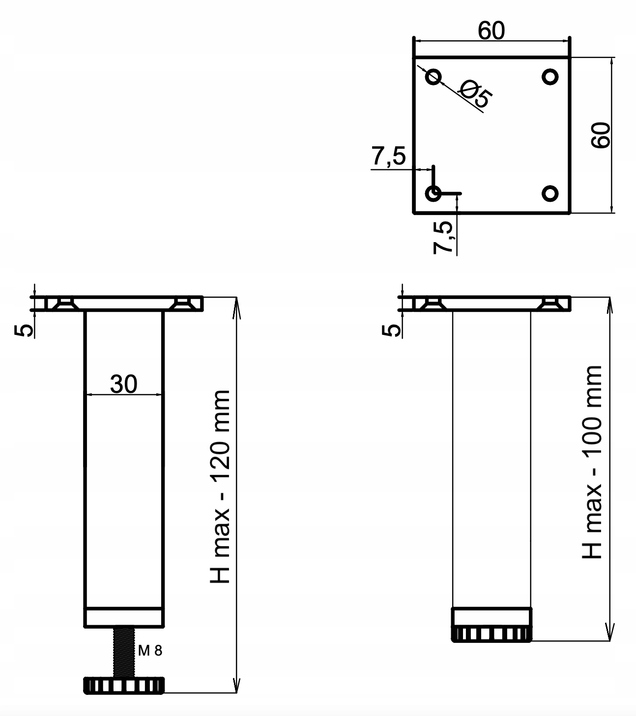 Один торець. оснащена монтажною пластиною розміром 60х60 мм, а друга має пластиковий регулятор, який дозволяє змінювати висоту додатково на 20 мм і захищає підлогу від подряпин.