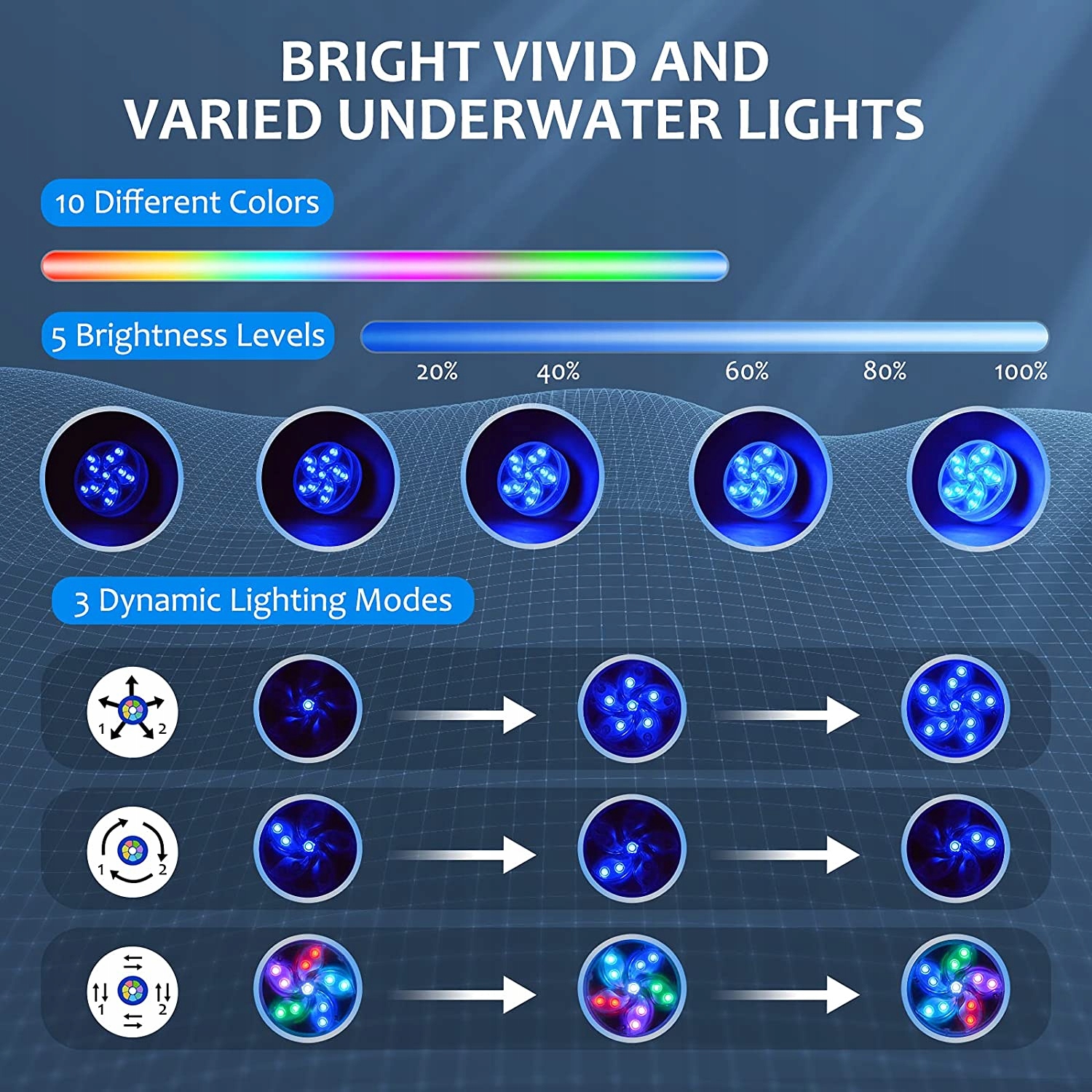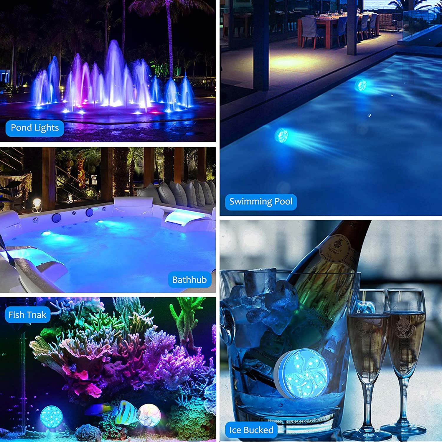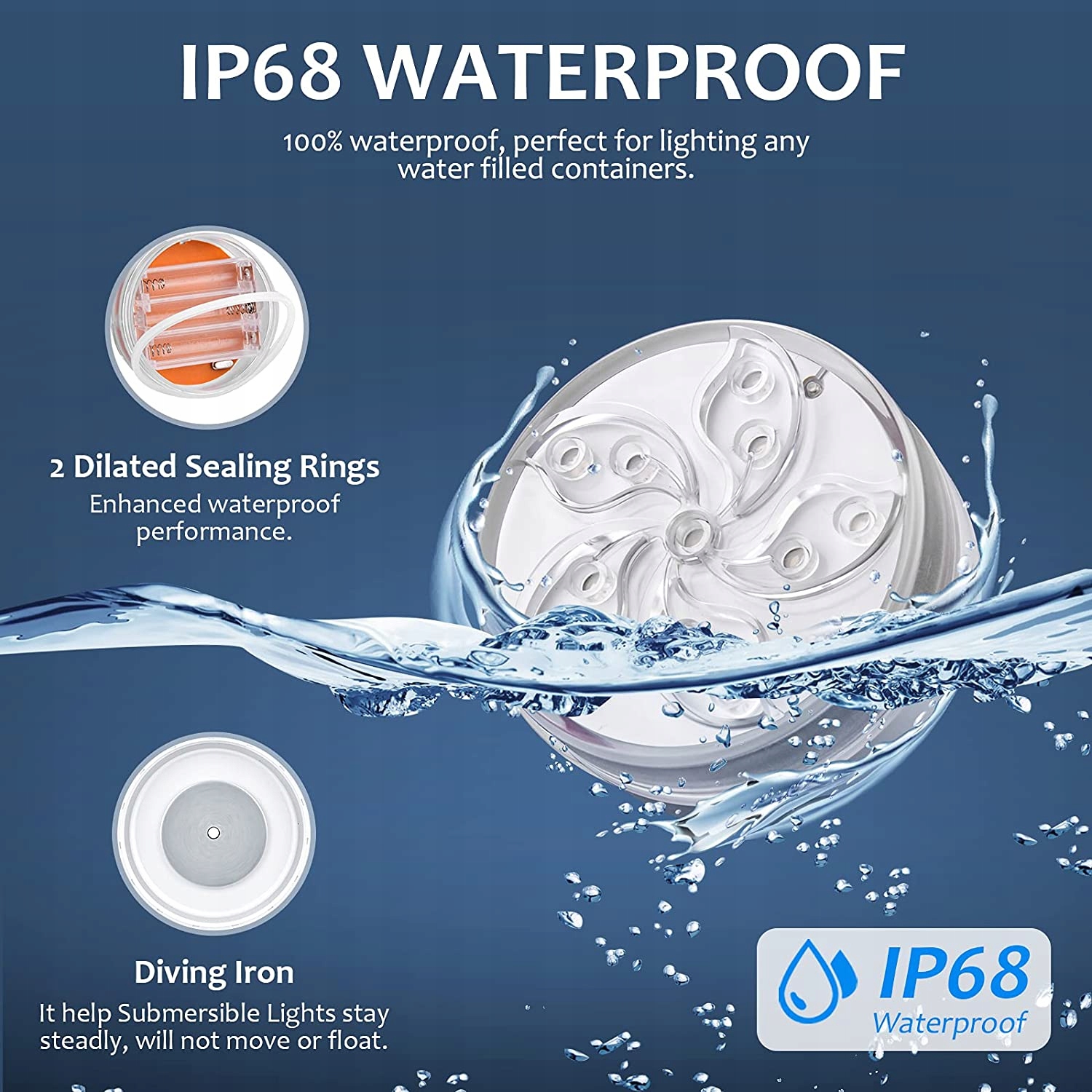 ☀【Оновлений водонепроникний дизайн IP68】100% водонепроникний занурювальний світильник із сильними магнітами та присосками та оновлений повністю водонепроникний водонепроникний дизайн, добре працює в басейні, ставку, човні, фундаменті, акваріумі, акваріумі, вазі, вазоні. також ідеально підходить для сцени, дискотеки, торгових центрів, ювелірних магазинів, виставкових залів, музеїв.