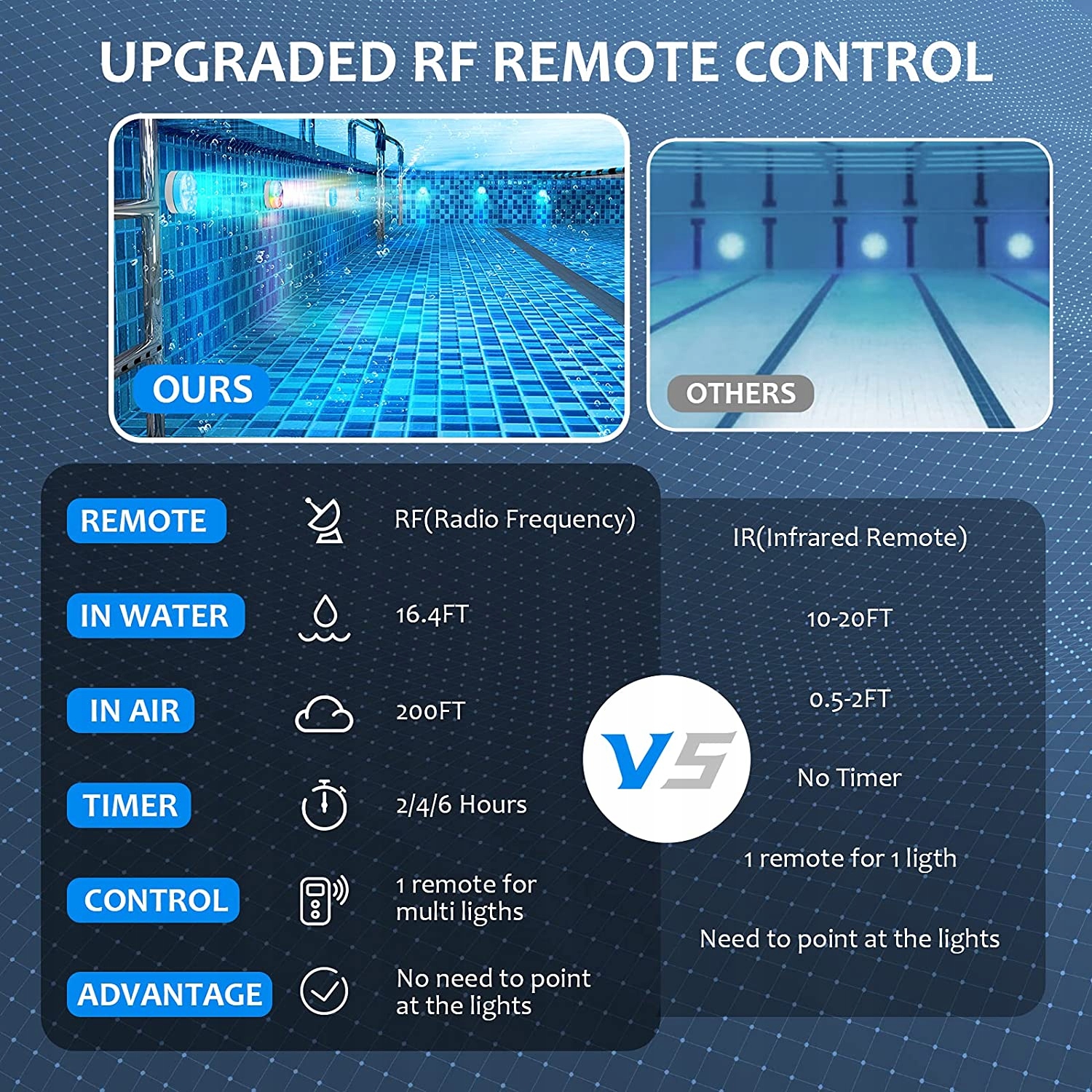 ☀【Зручний радіочастотний пульт дистанційного керування】 Оснащений 2 інтелектуальними радіочастотними пультами дистанційного керування, ви можете легко встановлювати різні режими. Один пульт дистанційного керування може керувати кількома лампами. Не турбуйтеся про блокування сигналу навіть у дуже великому басейні завдяки дистанції керування 10M.ccc
