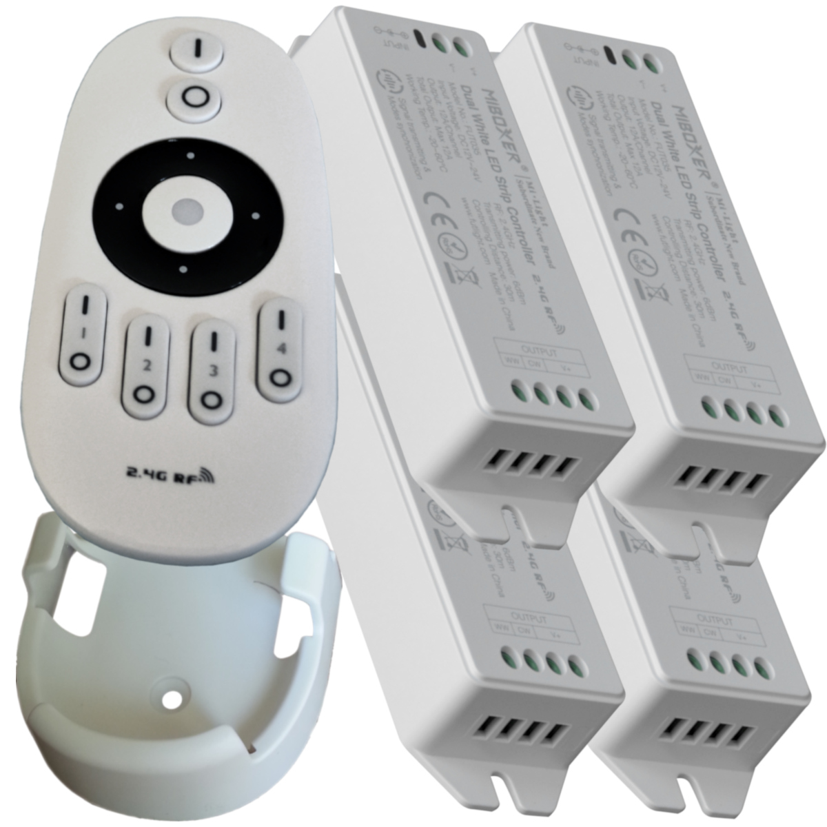 4-зонний пульт MILIGHT FUT007 2.4 GHz WiFi з чотирма контролерами зон Miboxer FUT035 2.4 GHz 12A WiFi CCT для керування двоколірними світлодіодними стрічками CCT з напругою живлення DC 12-24V. У набір також входить естетичний тримач для кріплення пульта дистанційного керування на стіні.