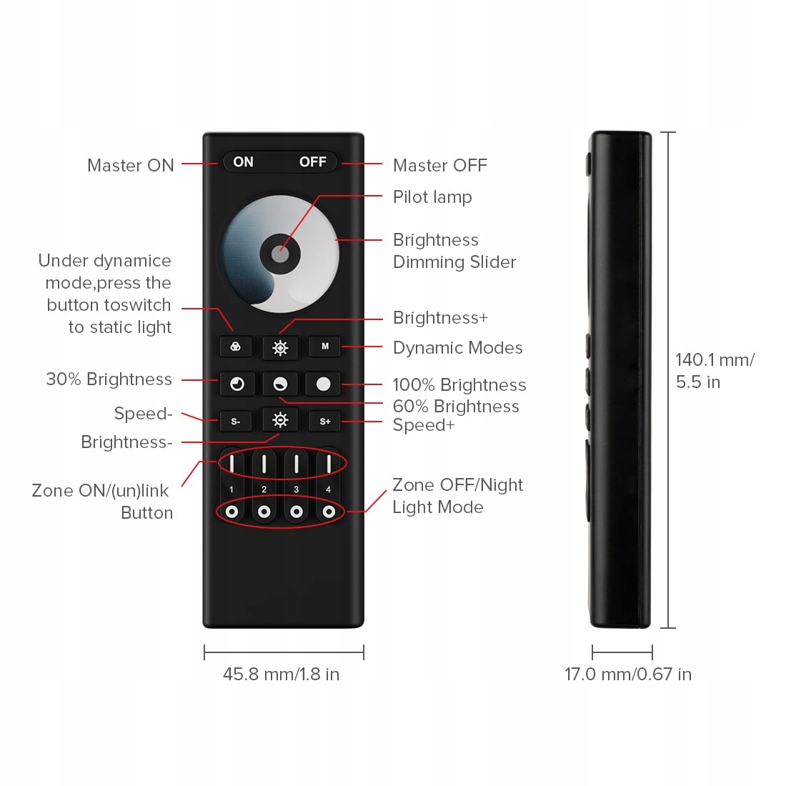 Пульт дистанційного керування RC02RFB-DIM&CCT — це універсальний і простий у використанні пристрій, призначений для керування затемненням світлодіодного освітлення Dim to Warm/Hybrid у кількох зонах. Цей пульт дистанційного керування працює на основі радіосигналу (RF), що дозволяє керувати світлодіодним освітленням на відстані до 30 метрів (98 футів)