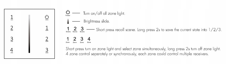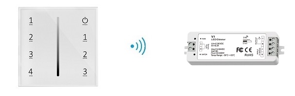 Це настінна панель для бездротового регулювання яскравості монохроматичного освітлення. Ця панель дозволяє вмикати/вимикати та регулювати яскравість освітлення за допомогою сенсорного повзунка. Сенсорні поля панелі дозволяють точно контролювати інші параметри освітлення. Пульт дозволяє управляти одноколірним освітленням в одній з чотирьох зон. Зв'язок між світлодіодною панеллю та приймачем світлодіодного затемнення здійснюється через радіо. Діапазон його дії становить 10 метрів і може бути збільшений завдяки функції автопередачі приймачів. Для живлення панелі достатньо двох батарейок ААА. Виконано в сучасному корпусі з білою скляною сенсорною панеллю.