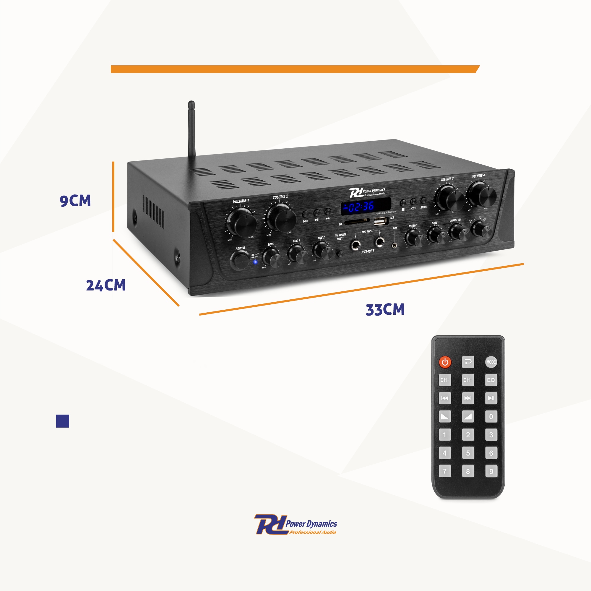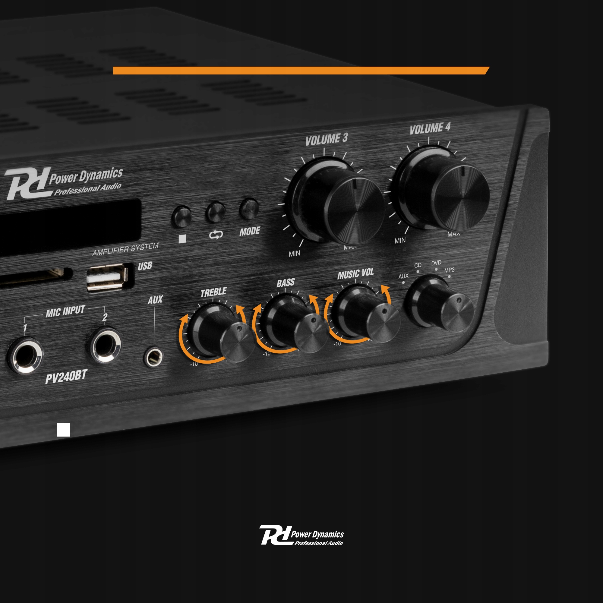 Power Dynamics PV240BT — це 4-зонний стереопідсилювач, за допомогою якого можна регулювати гучність 4 зон окремо. Завдяки PV240BT ви створите багатозонну стереосистему для офісу, ресторану тощо.