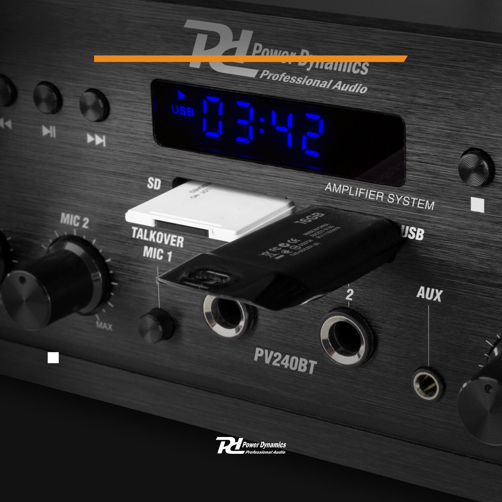 Крім Bluetooth, підсилювач також оснащений вбудованим MP3-плеєром з дистанційним керуванням. Вставте USB-накопичувач або SD-карту з музикою у форматі MP3 у відповідний слот, і внутрішній програвач відтворить музику для вас. Після цього на дисплеї з’явиться необхідна інформація. На передній панелі підсилювача є 3,5 мм вхід AUX, до якого можна швидко і легко підключити джерело звуку. Крім того, на задній панелі є два входи RCA для підключення зовнішнього обладнання, такого як програвач компакт-дисків або DVD-програвач. За потреби до PV240BT можна під’єднати сабвуфер, для цього на задній панелі є окремий вихід для сабвуфера.