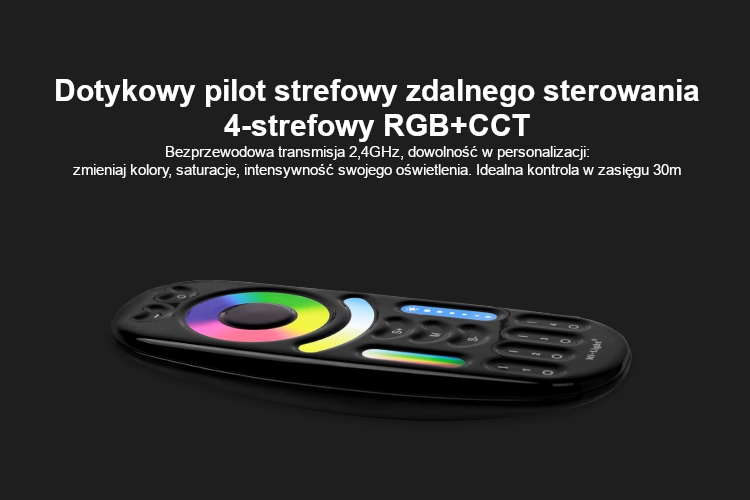 Плавна зміна кольорів - пульт дистанційного керування дозволяє «плавно змінювати» кольори (кольорові переходи), завдяки чому ми можемо балансувати між делікатними кольорами в моменти релаксації до сильних, сміливих кольори під час тренувань або прослуховування динамічної музики. Усе це завдяки сенсорній технології, використаній у конструкції цього пульта дистанційного керування. Кольори змінюються за допомогою палітри кольорів, яка міститься в кольоровому колі, розміщеному на пульті дистанційного керування, просто торкніться кольору, який потрібно підсвітити на смузі, а потім просто проведіть пальцем по палітрі кольорів, щоб плавно змінити колір на інший .