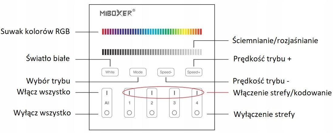 - Індивідуальне керування кожною з 4 зон освітлення (до кожної зони можна призначити будь-яку кількість приймачів Mi-Light )