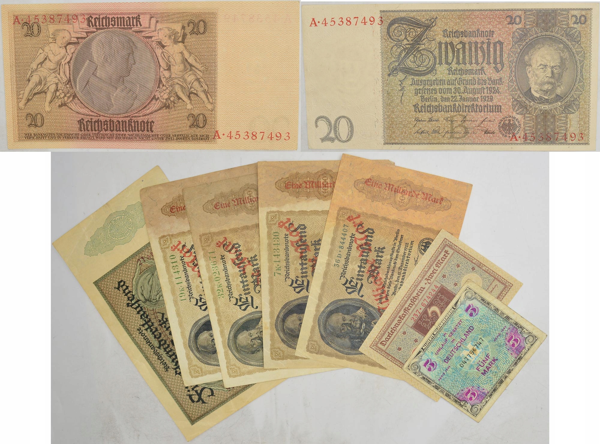 - Опис: набір містить банкноти з такими номіналами: 2 марки 1920 р., 20 рейхсмарок 1929 р., 1000 марок/1 мільйон марок 1922 р. (4 шт.), 5 марок 1944 р., 500 000 марок 1923 р.