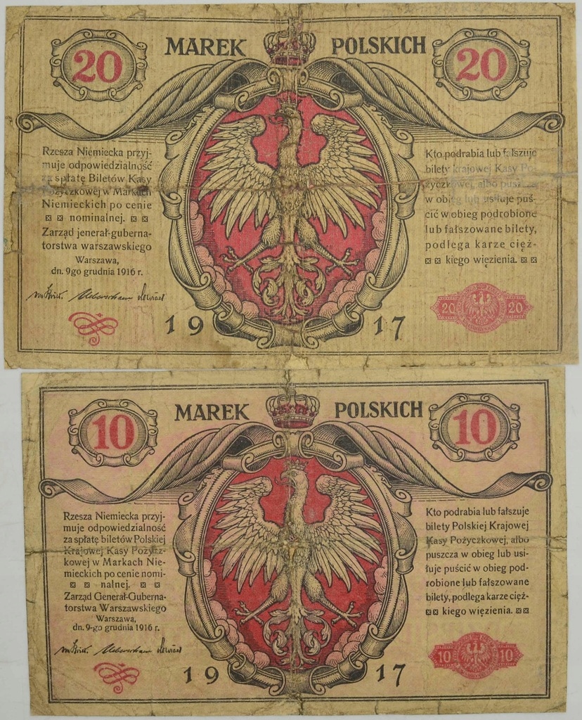 - Опис: У набір входять банкноти номіналом: 10 польських марок 1916 р. «Генеральна», «квитки», 20 польських марок "General" - обидва з 1916 року. Виправлені дефекти.