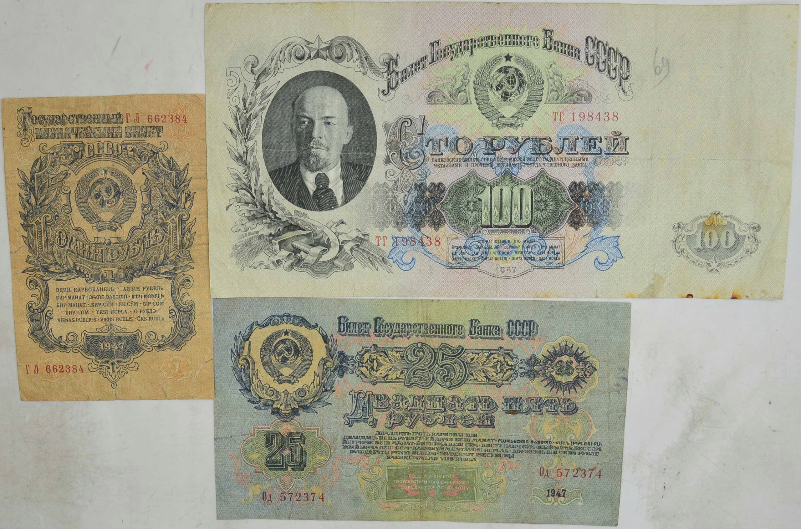 - Опис: У набір входять банкноти номіналом: 1 рубль (St.3/3+), 25 рублів (St.3/3+), 100 рублів (St.3/4+) ) - усі з 1947 року