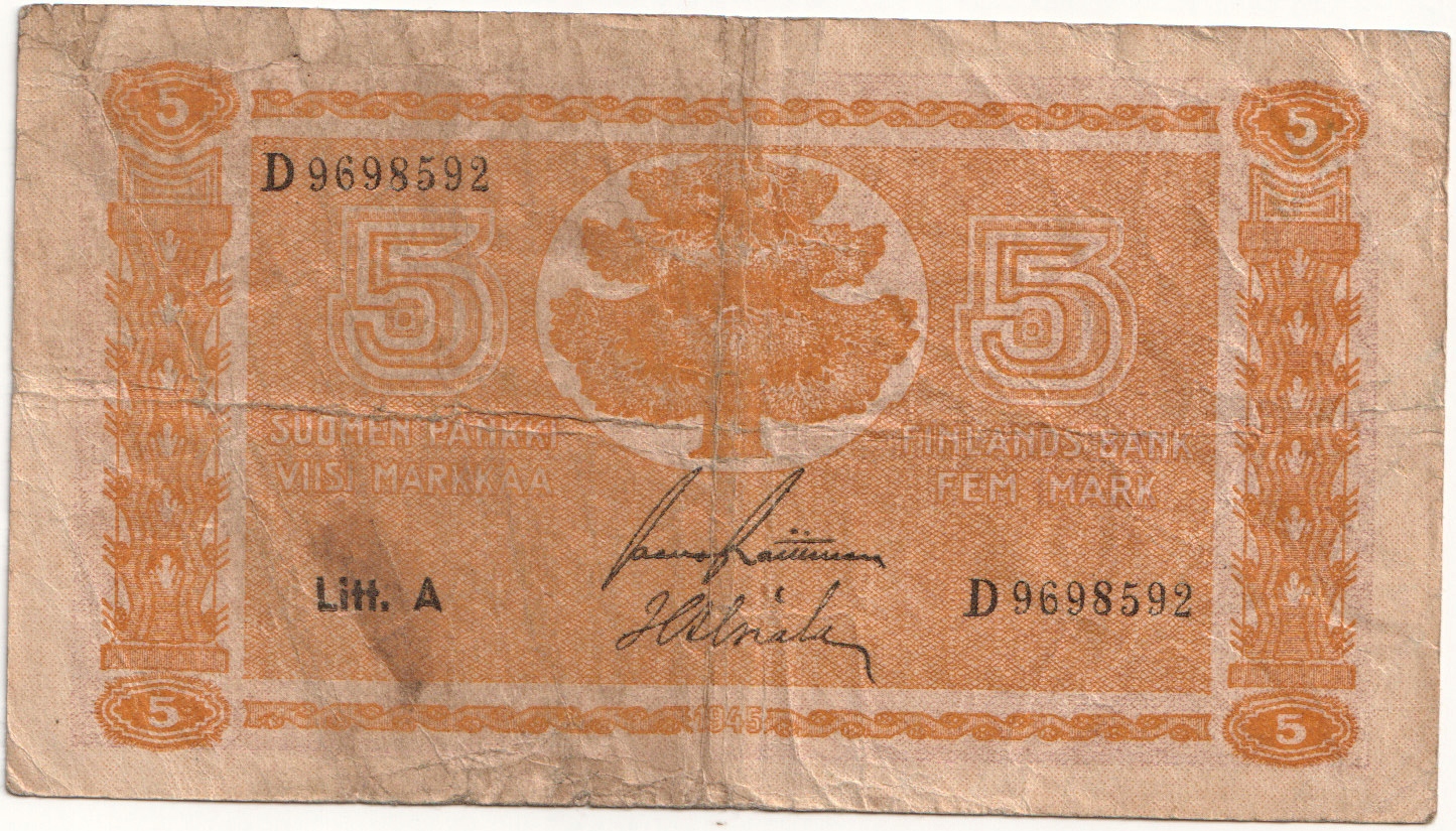 4. Фінляндія, 5 Markkaa 1945, P.76.a, St.3