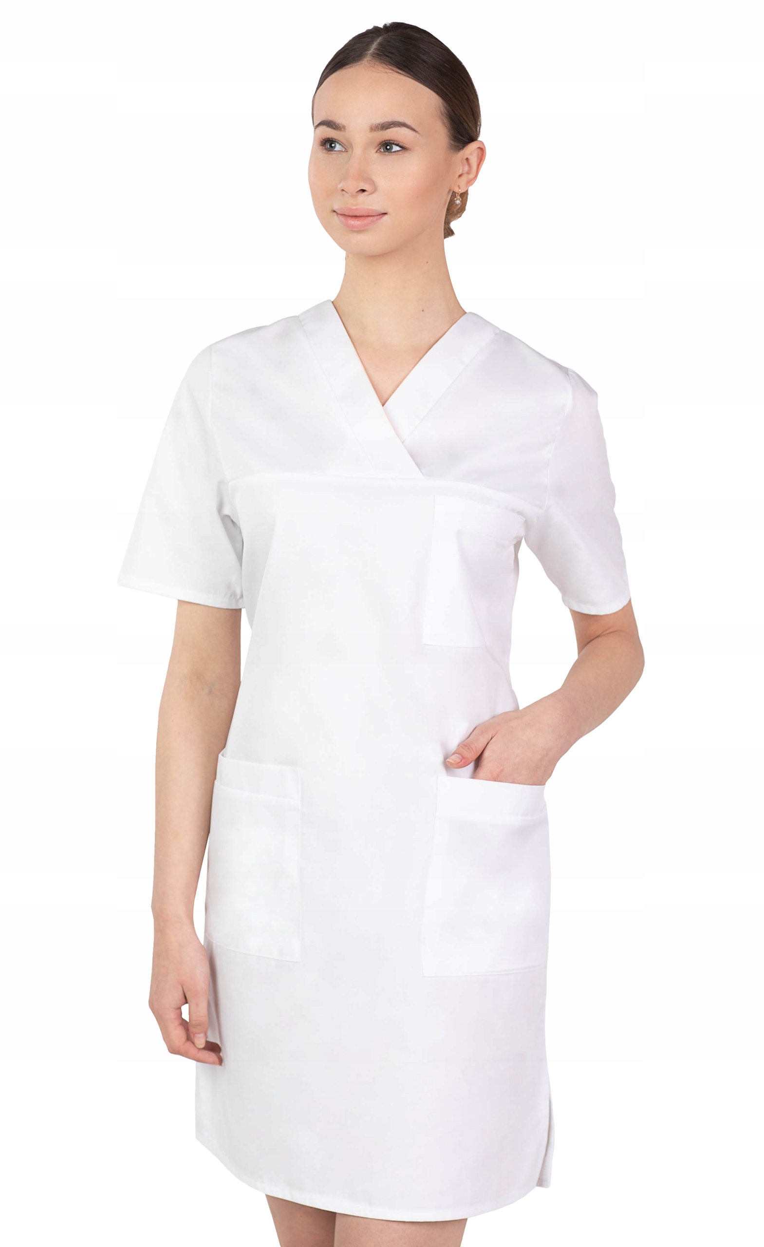 Плаття жіноче накладне. Злегка приталений, з короткими рукавами, має дві великі бічні кишені та одну меншу на грудях зліва. На талії є вшитий пояс, який зав'язується ззаду для кращої посадки.