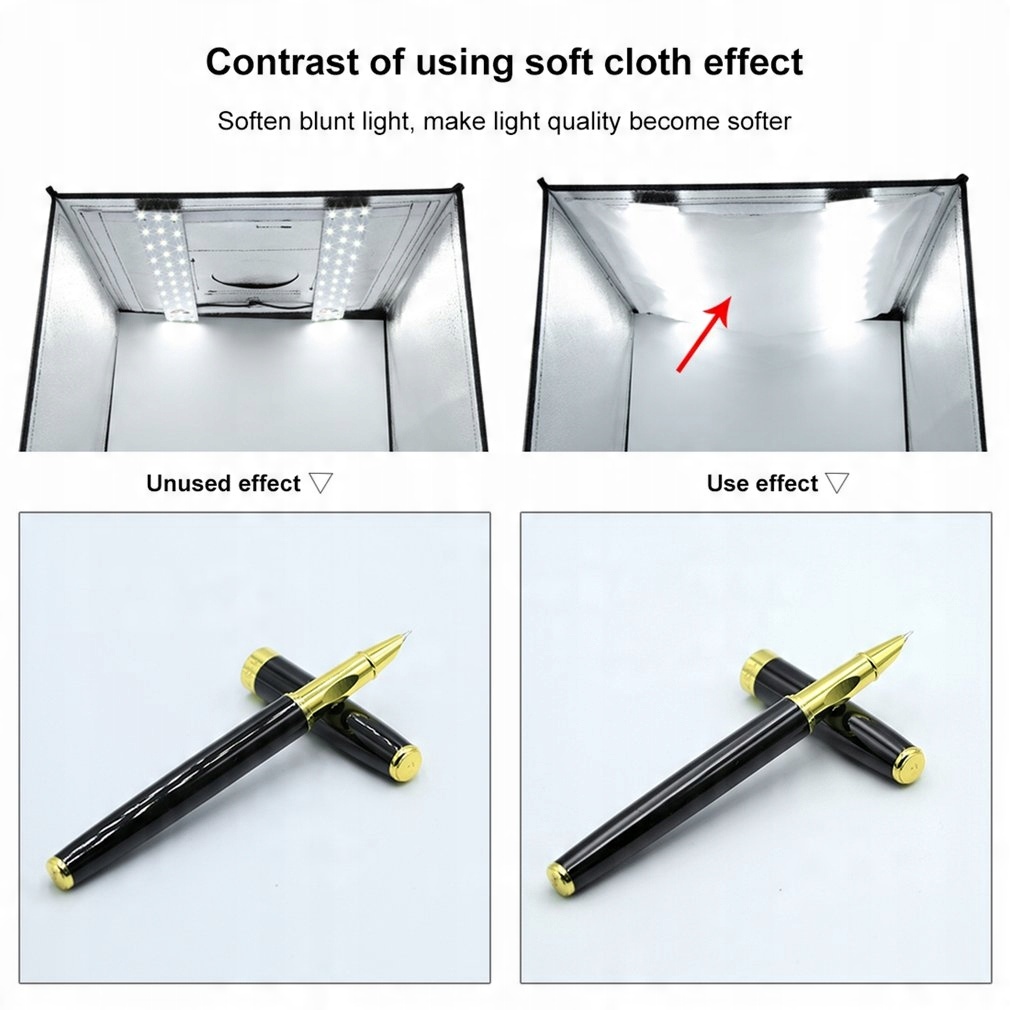 Крім того, в набір входять світлодіодні лампи, які монтуються безпосередньо в конструкції безтіньового намету. Завдяки цьому все світло направляється всередину намету і ідеально розсіюється внутрішнім покриттям. Нам не потрібно турбуватися про недоекспонування об’єкта, тому що лампи були спеціально розроблені та підготовлені для такого розміру набору, забезпечуючи ідеально підібране освітлення.