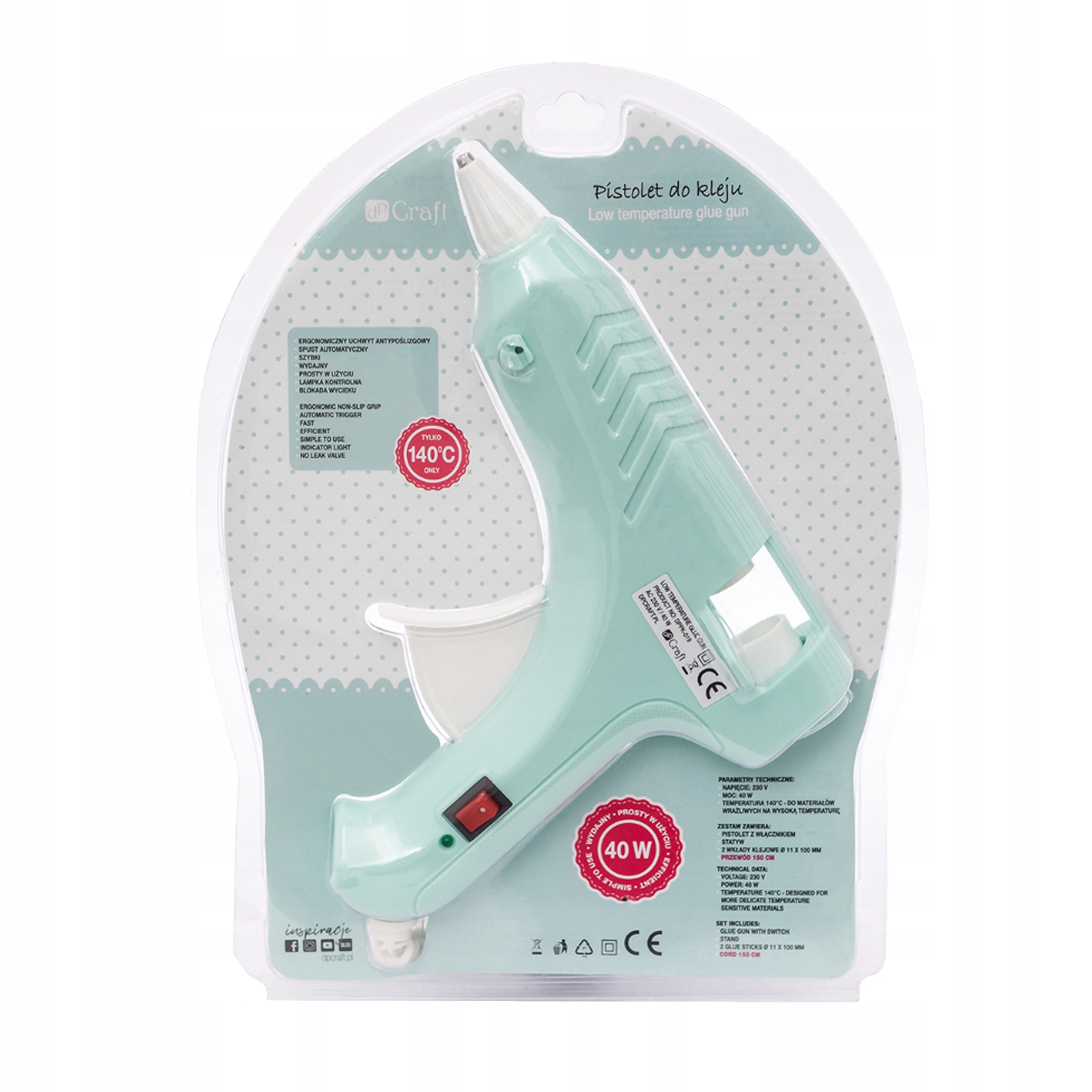 Низько -температура, високоякісна клейова зброя. Пристрій простий у використанні та дуже ефективний, оскільки він має замок витоку. Нагріває клей протягом 5 хвилин до максимальної температури 140 градусів. У клейовому пістолеті також є контрольна лампа, яка інформує про її відповідне опалення. Додатковою перевагою продукту є ергономічна ручка анти -слизування, що забезпечує більш комфортне зчеплення, вдосконалюючи комфорт роботи.