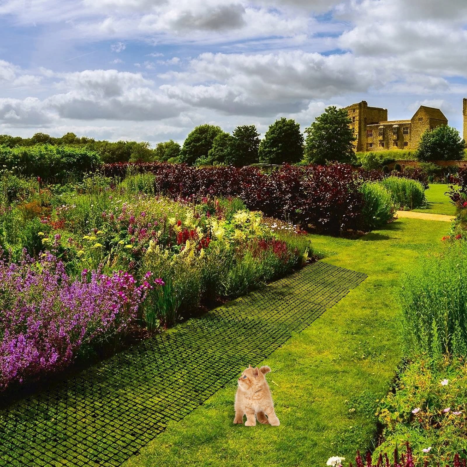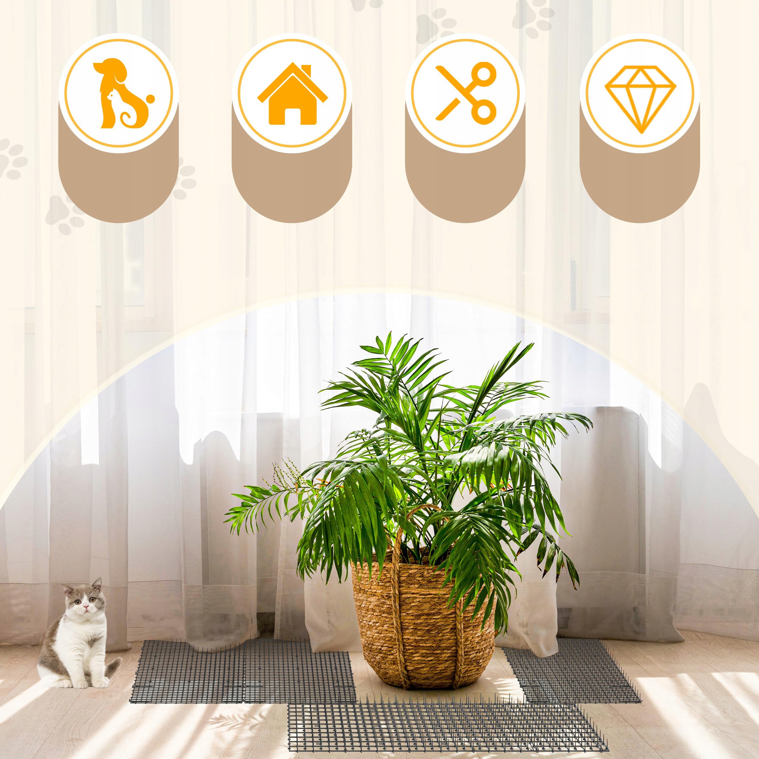 Котяча сітка містить 16 U-подібних шпильок на вулиці можна покласти на підлогу килимки для котячих туалетів і закріпити їх садовими цвяхами. Для використання всередині приміщень просто помістіть цей захисний килимок із шипами там, де хочете.