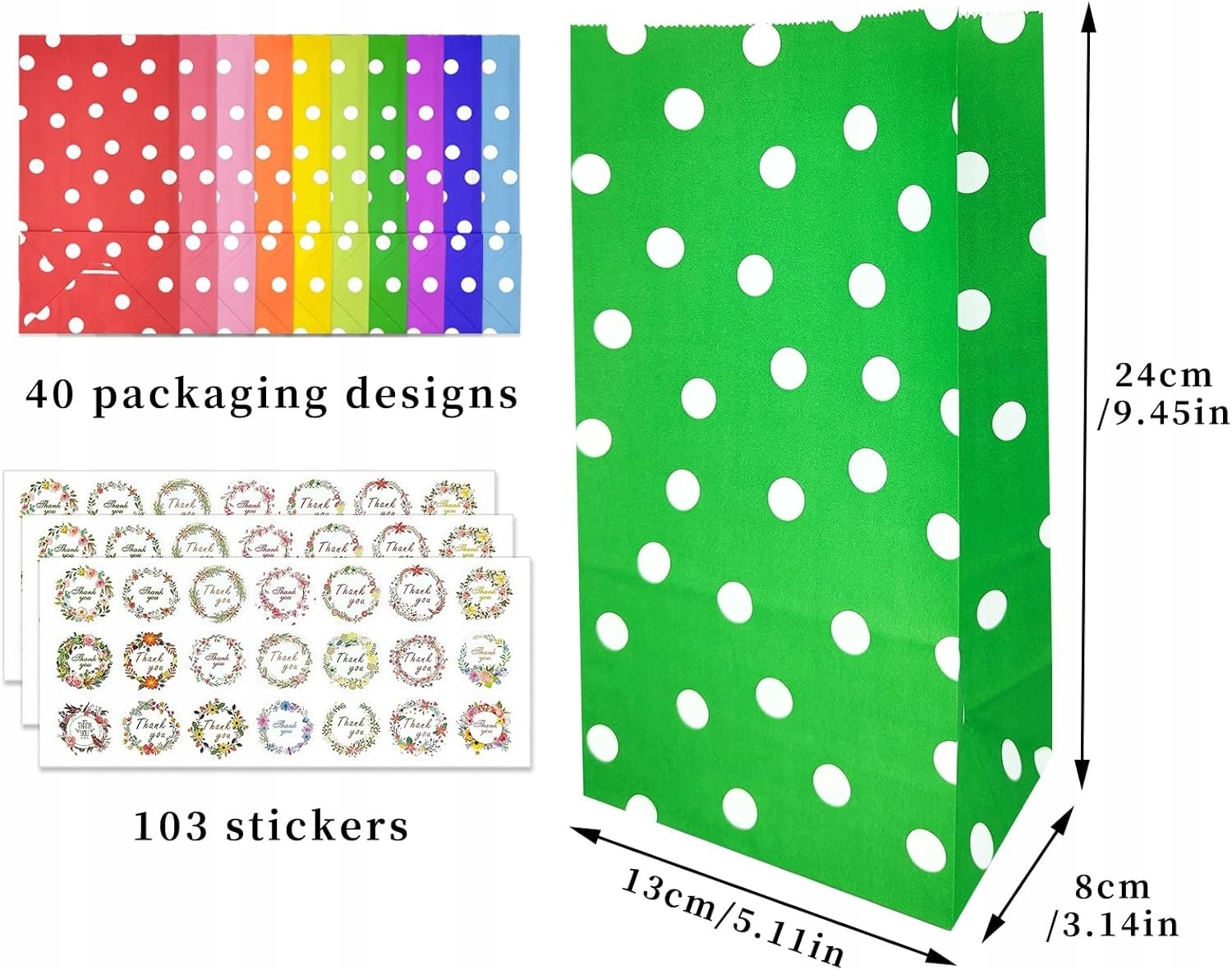 Набір 40 Паперові подарункові пакети - ідеальне рішення для дня народження, вечірки, дитячого садка та інших випадків . Сумки виготовлені з міцного паперу і мають універсальний розмір 24 x 8 x 13 см , завдяки якому вони підійдуть до різних маленьких подарунків та солодощів.