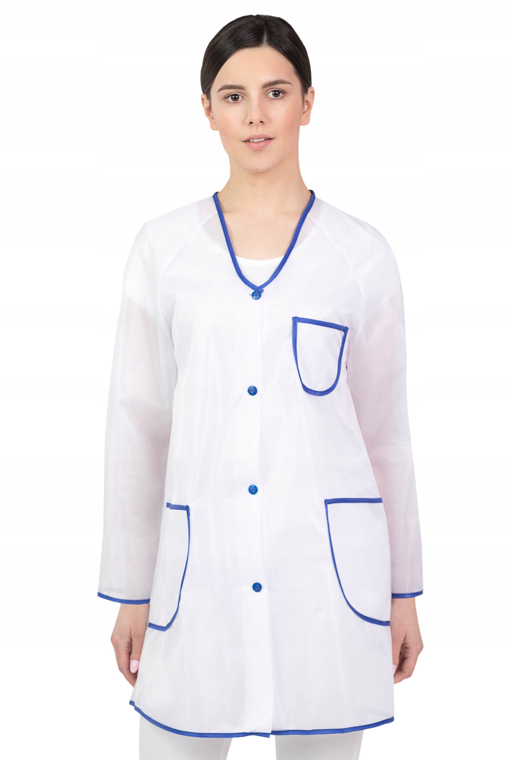 Фартух захисний жіночий. З тканини дедерон 100% поліестер, довгі рукави, застібаються на гудзики, три практичні кишені, декоративна обробка. Призначення: фартух призначений для людей, які працюють у таких галузях: харчова, громадське харчування, промисловість.