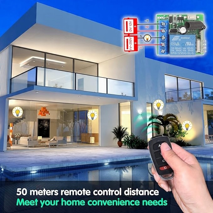 - Широке застосування: продукти можна використовувати в будинках, на фермах, на фабриках, в офісах, лабораторіях, супермаркетах тощо. Будь-який пристрій, підключений до релейного приймача, можна дистанційно використовувати за допомогою дистанційного керування. Такі як електричний замок, електромагнітні двері, вентилятор, лампа, освітлення, вентиляційний пристрій, водяний насос, передача сигналу та саморобний перемикач дистанційного керування.