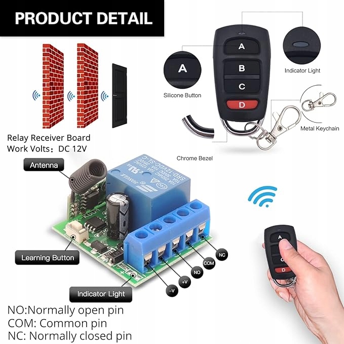 - 【Більша гнучкість】 Цей приймач використовує високоякісне реле 10 A, яке можна використовувати понад 100 000 разів. Нехай цей продукт буде більш міцним і стабільним у використанні. Є 3 термінали (нормально відкритий, загальний, нормально закритий) для бездротового передавача. Захисний приймач на 12 В. 4-кнопковий передавач, який може дистанційно керувати 4 приймачами