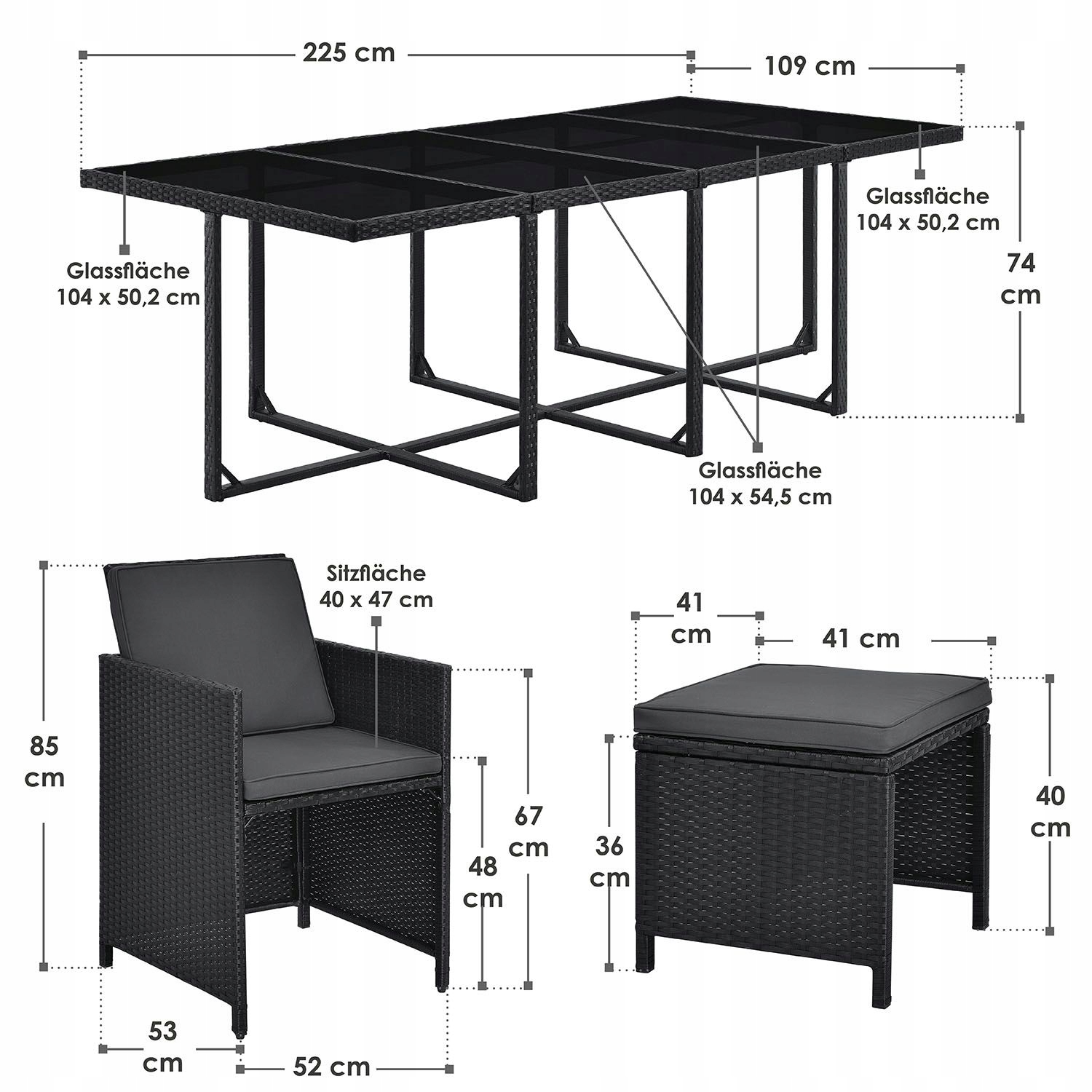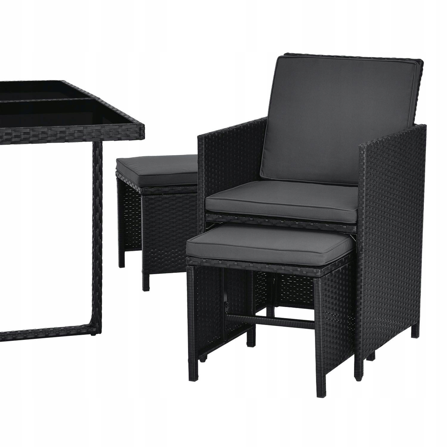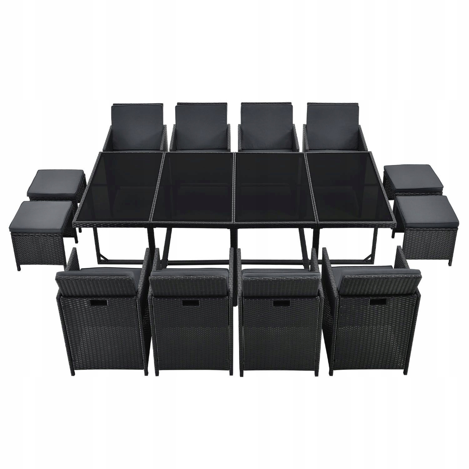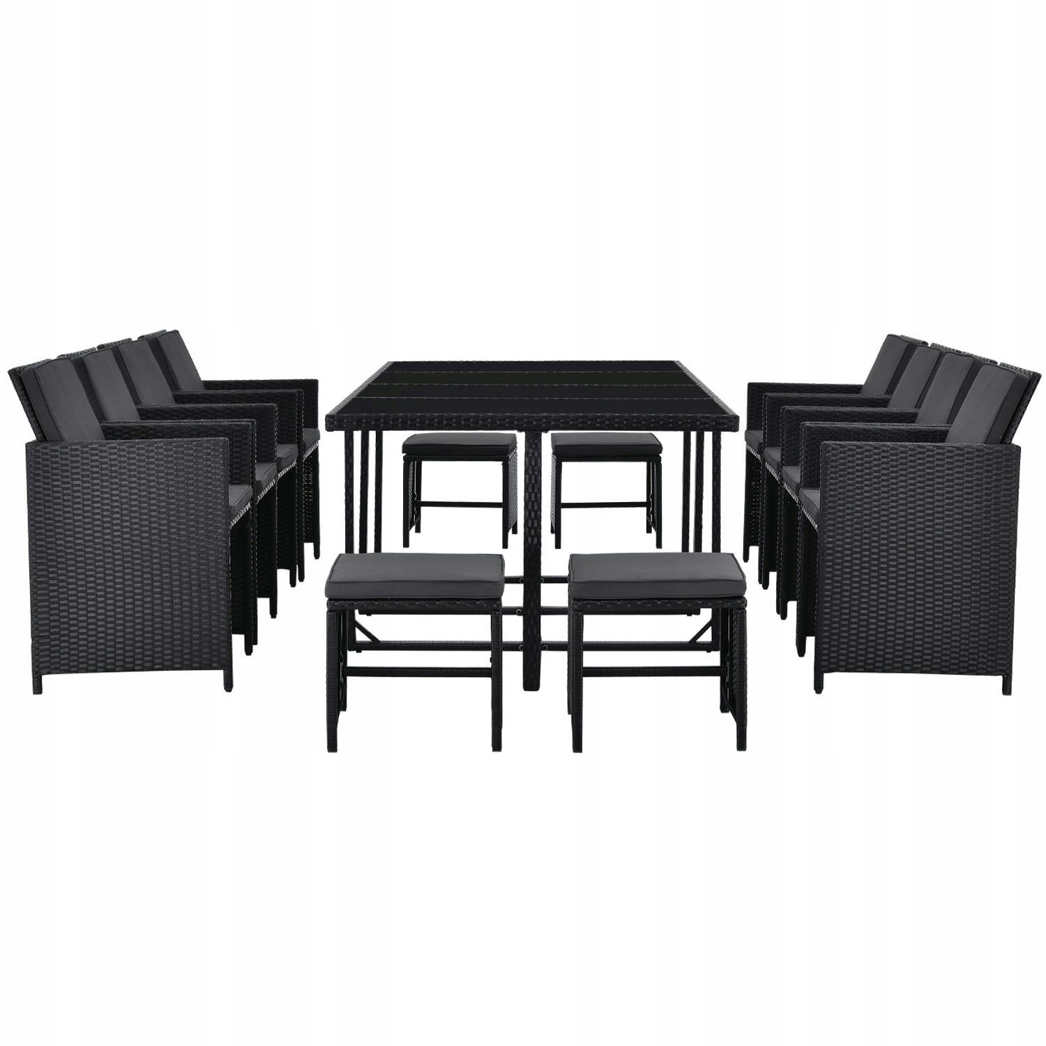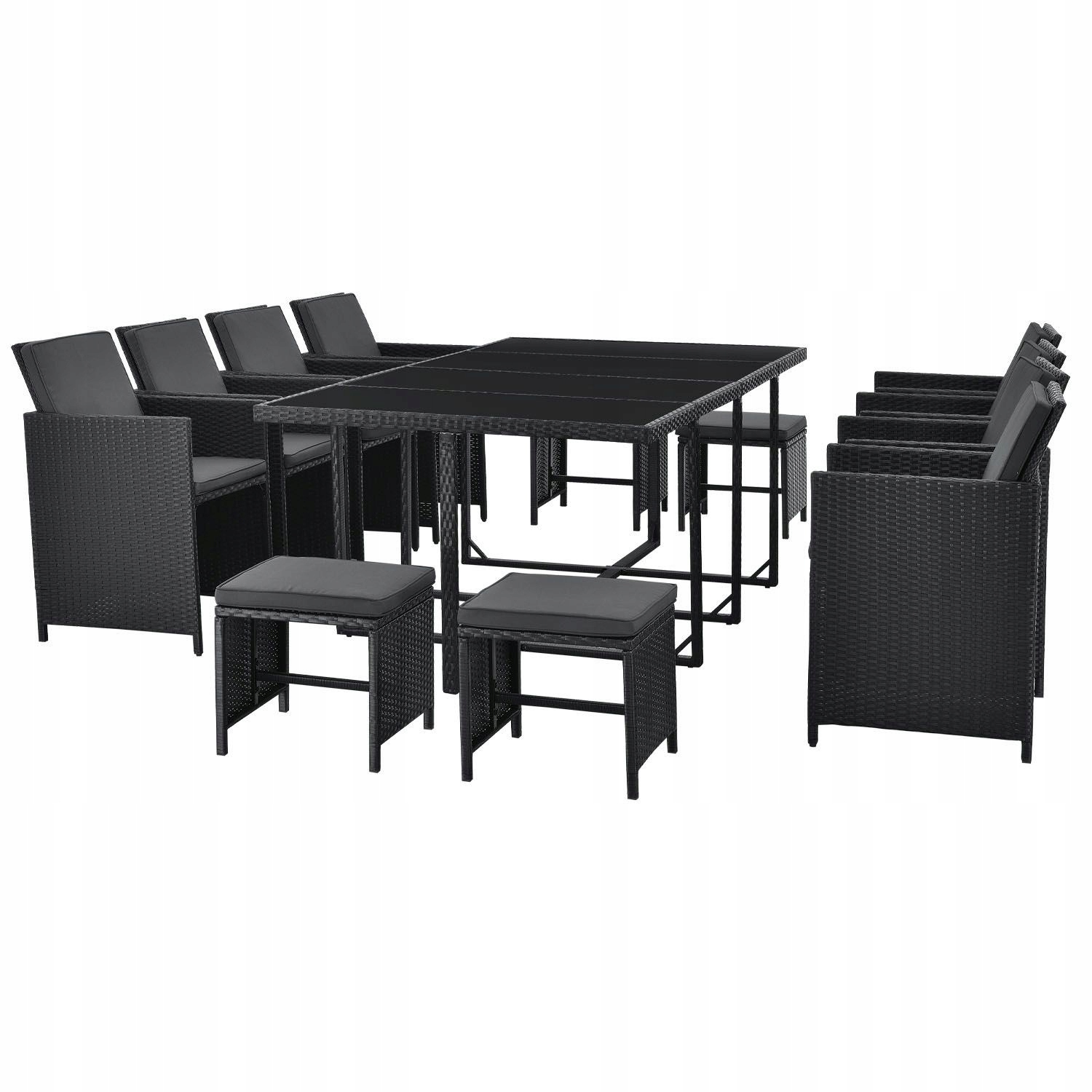 Довгі, теплі літні вечори - ідеальна можливість познайомитися з друзями чи родиною. Наш великий, 13-частинний садовий набір пропонує місце для максимум 12 людей, і в той же час переконує дивовижно економічну технологію зберігання у вигляді куба. Великий набір сидіння з Полістану в рівномірному чорному кольорі з сірими подушками виглядає сучасним і ідеально підходить до вашому саду чи терасі. Група для сидіння на вулиці може бути оптимально використана як обідній стіл, так і місце для відпочинку.