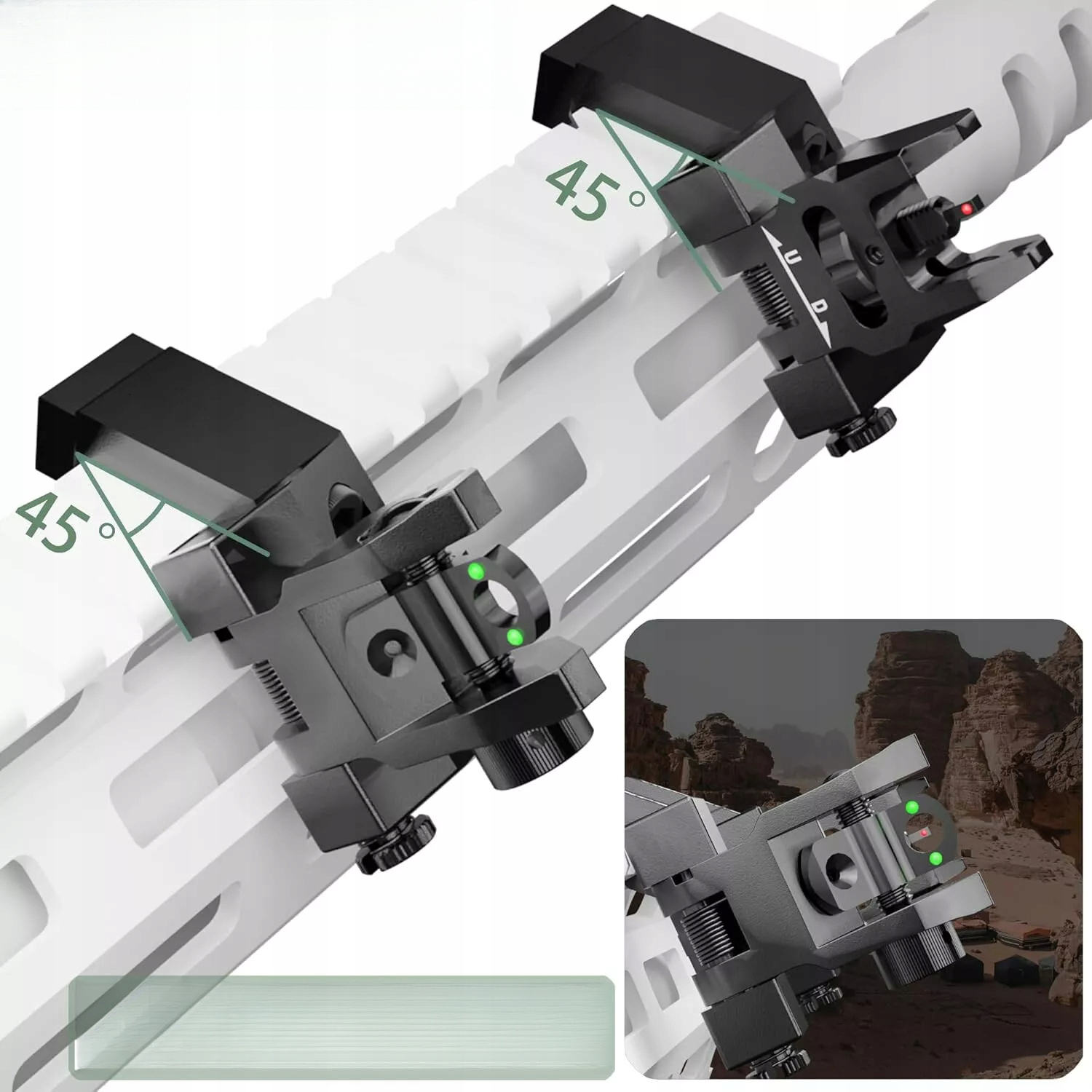 Прицільні пристосування під кутом 45 градусів підпружинені, і їх можна легко активувати натисканням кнопки. Він сумісний з більшістю гвинтівок і рушниць. Вони миттєво обертаються та фіксуються на місці, забезпечуючи швидку та позитивну дію, коли кнопку відпустити.