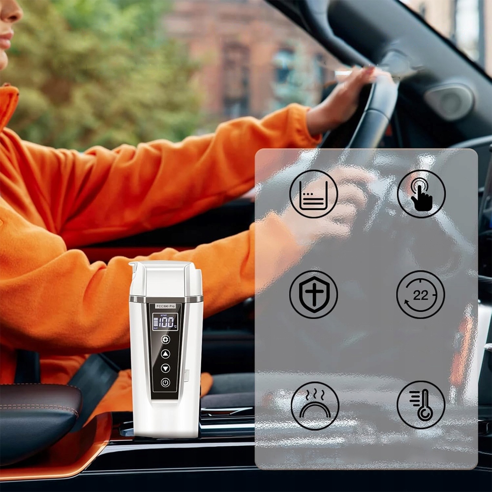 Автомобільний чайник 12 В/24 В із великим світлодіодним дисплеєм. Розумні сенсорні кнопки для налаштування потрібної температури та чіткий дисплей. Автомобільний чайник портативний, його можна використовувати в автомобілі, таксі, вантажівці або подорожувати з дитиною. Зробіть свою подорож приємнішою.