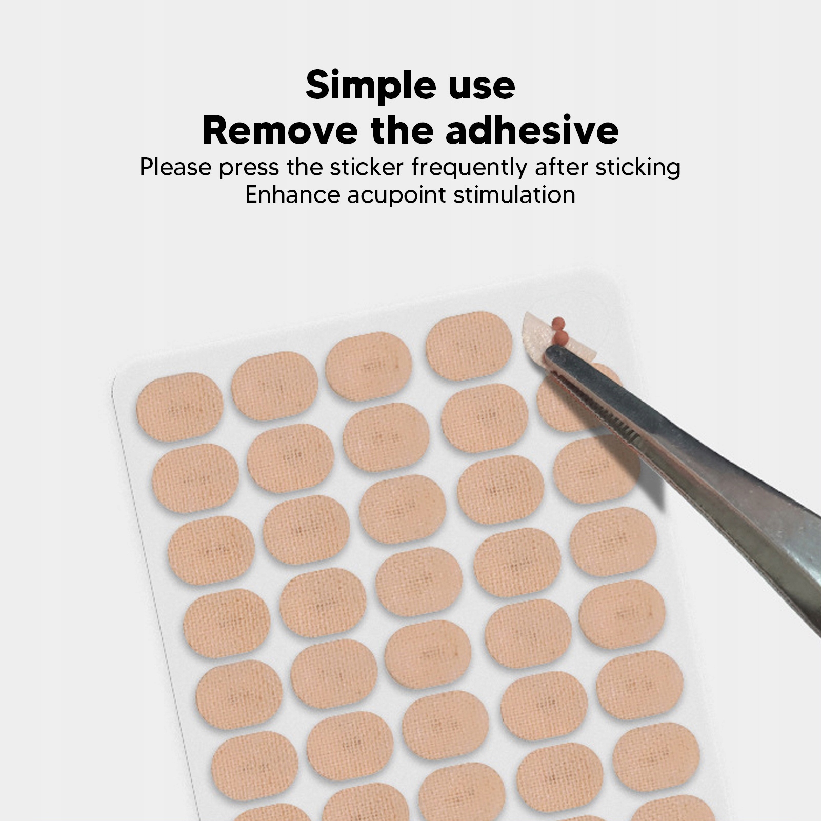 4. Простий у використанні: просто зніміть клей і приклейте наклейки безпосередньо до точок акупунктури вуха. Після нанесення не забувайте часто натискати наклейки, щоб посилити акупунктурну стимуляцію та максимізувати її ефективність.