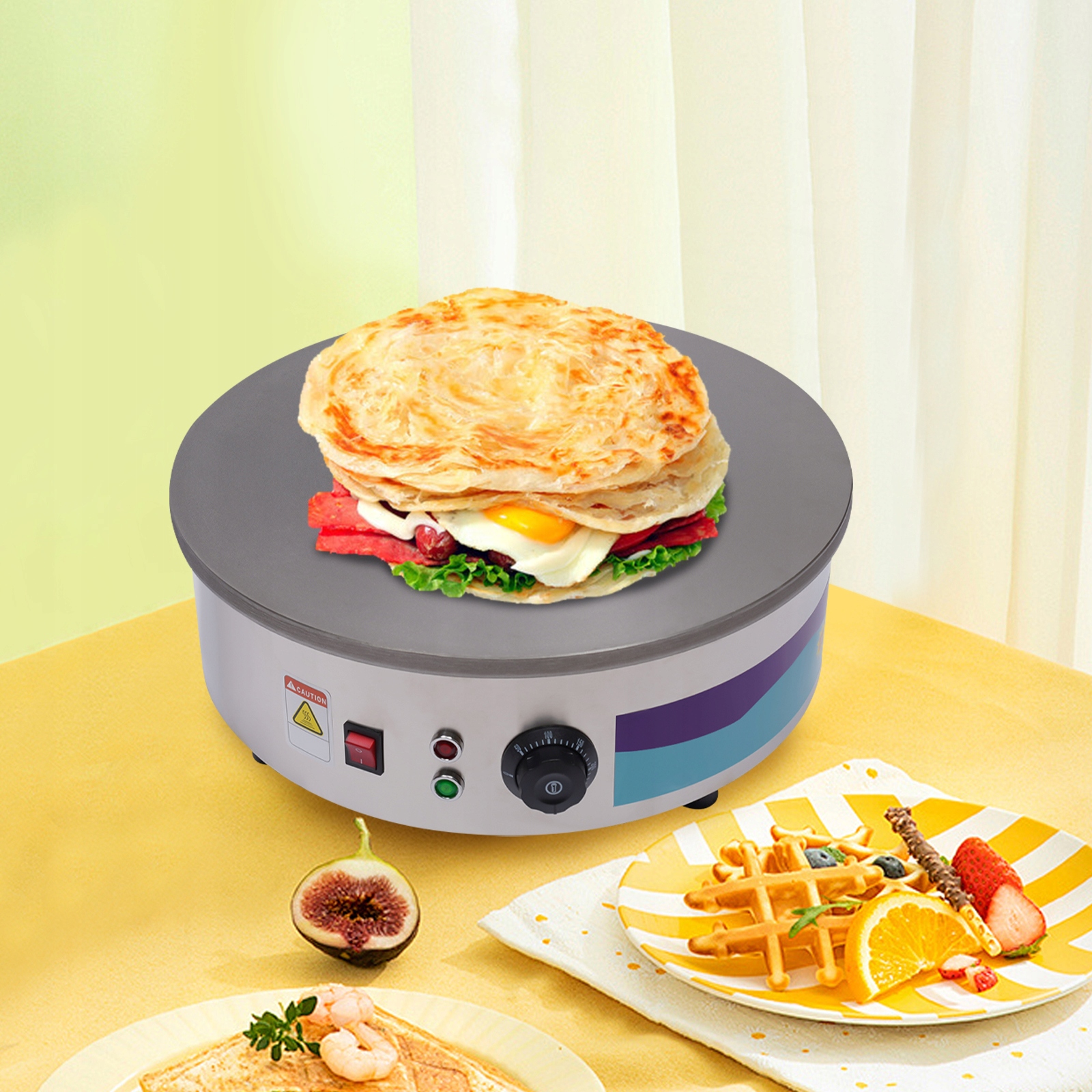 Цей продукт може широко використовуватися в обробних відділах державних органів, на заводах, шахтах, у збройних силах, школах, ресторанах, їдальнях і закладах громадського харчування. Також підходить для дому, пекарень, закладів швидкого харчування, ресторанів, кафе тощо, щоб смажити млинці, бекон, яйця, оладки, блінці, омлети, коричневі тістечка та багато інших улюблених страв для сніданку, щоб задовольнити ваші потреби у випічці своїми руками. Цей багатофункціональний продукт також функціонує як сковорода-гриль, тому ви можете використовувати його як вдень, так і вночі.