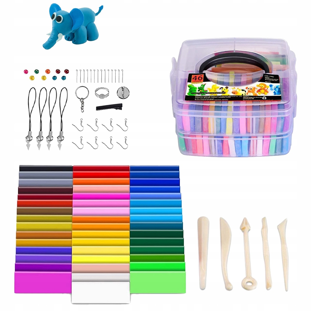 - 46 шматочків різнокольорової глини, випеченої в духовці (28 г/шт.), 1 подвійна коробка для зберігання, 5 інструментів для моделювання та 40 аксесуарів для ювелірних виробів, які зберігаються в красивій прозорій пластиковій коробці для зручності перенесення та зберігання.