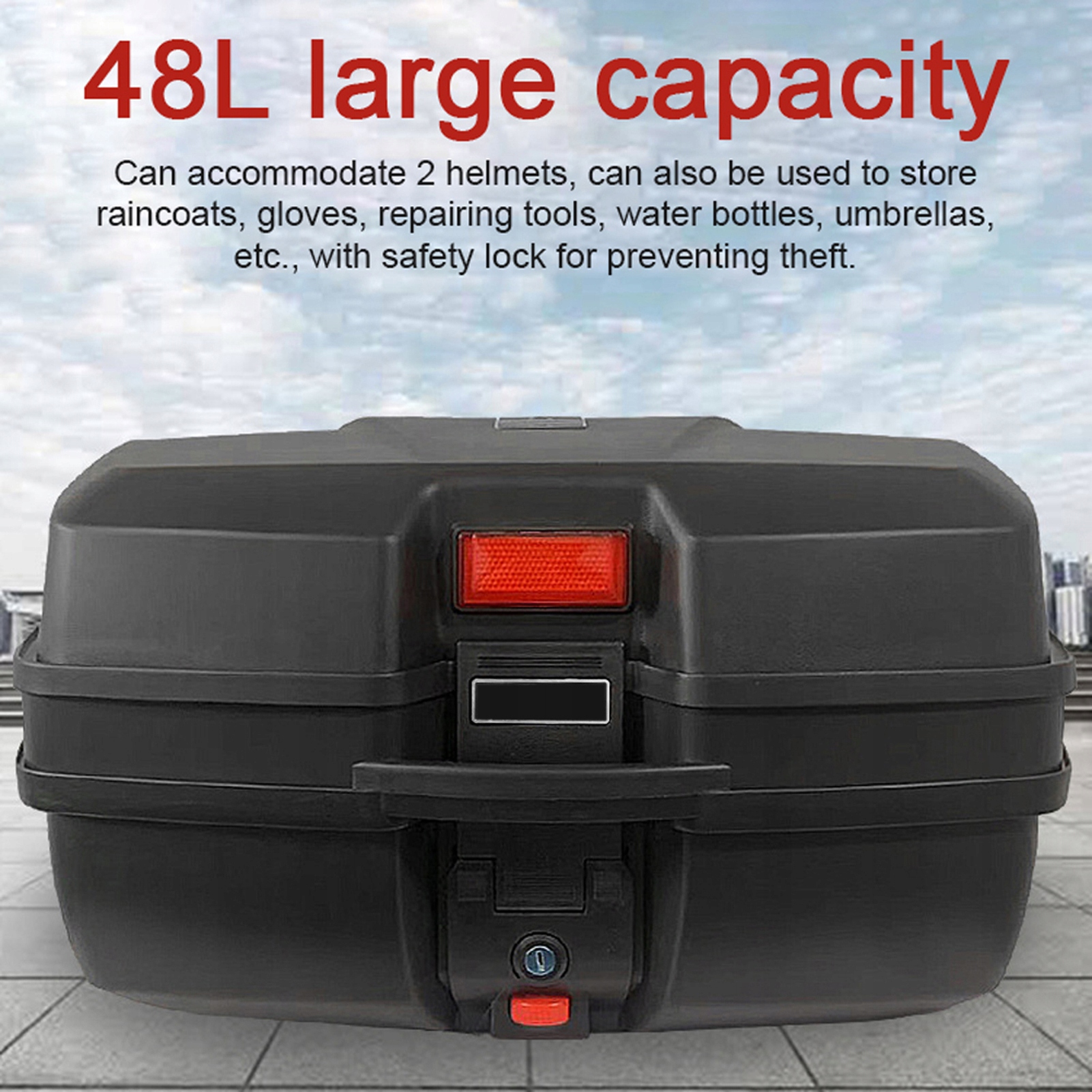 - 48 л Велика ємність, може вмістити 2 шоломи, також можна використовувати для зберігання плащів, рукавичок, інструментів для ремонту, пляшок з водою, парасолі тощо, з охороною замок, щоб запобігти крадіжці.