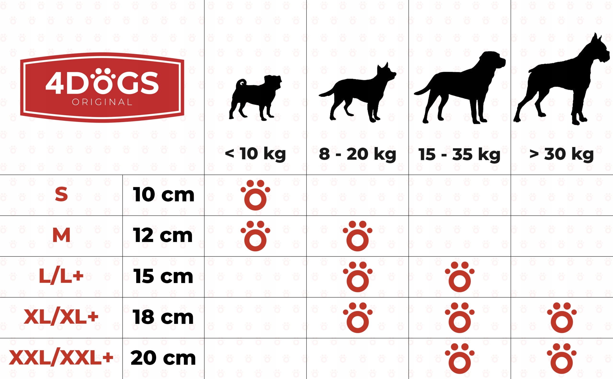 У таблиці поруч із нами ми пропонуємо, як вибрати ТЕТЕТЕР залежно від ваги собаки. Але також варто прийняти лінійку і намагатися візуалізувати, чи не буде довжина заданого розміру не занадто мало по відношенню до рота вашої собаки.