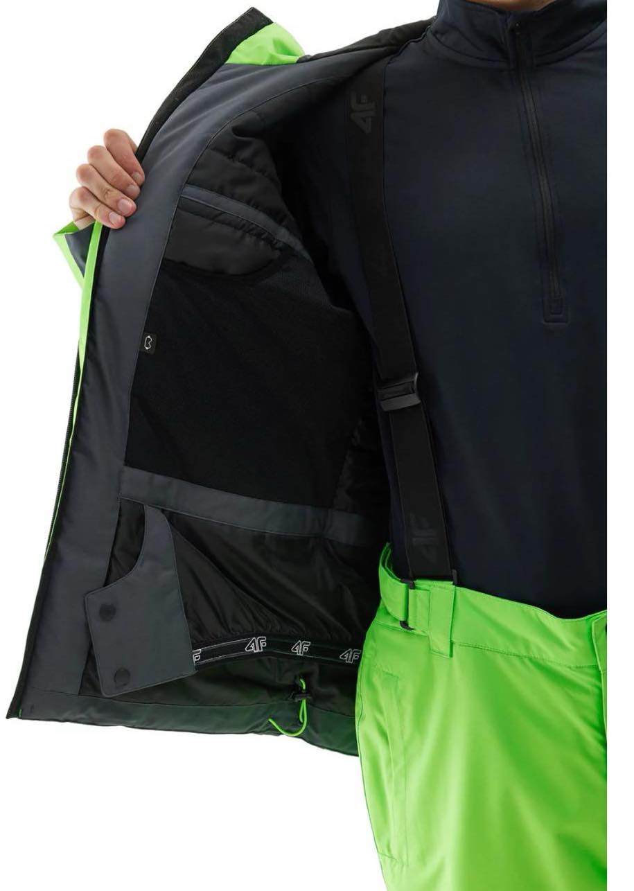 Чоловіча гірськолижна куртка 4FAW23TTJAM306 4F — ідеальний вибір для активних чоловіків, які цінують комфорт і захист від мінливих погодних умов. Виготовлений з високоякісних матеріалів, які гарантують довговічність. Мембрана NEO DRY WP 5000 / MVP 3000 забезпечить ефективний захист від дощу, вітру та холоду, що дуже важливо під час зимових заходів. Вбудований 2D регульований капюшон і снігова спідниця забезпечують додатковий захист від снігу та холоду. Куртка має дві бічні кишені та нагрудну кишеню на блискавці, кишеню для лижного абонементу на блискавці та внутрішню кишеню на липучці, що дозволить надійно зберігати необхідні речі під час занять на схилі. Крім того, регулювання внизу дозволить підігнати куртку відповідно до ваших потреб, тож вона завжди буде ідеально сидіти. Світловідбиваючі елементи підвищать вашу видимість у темряві. Застібка-блискавка на всю довжину із захистом підборіддя забезпечує ще більший комфорт під час носіння.