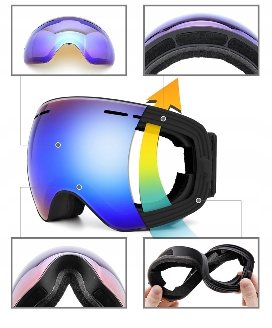 - регульована окружність ремінця та форма окулярів гарантують, що вони підходять для більшості лижних шоломів