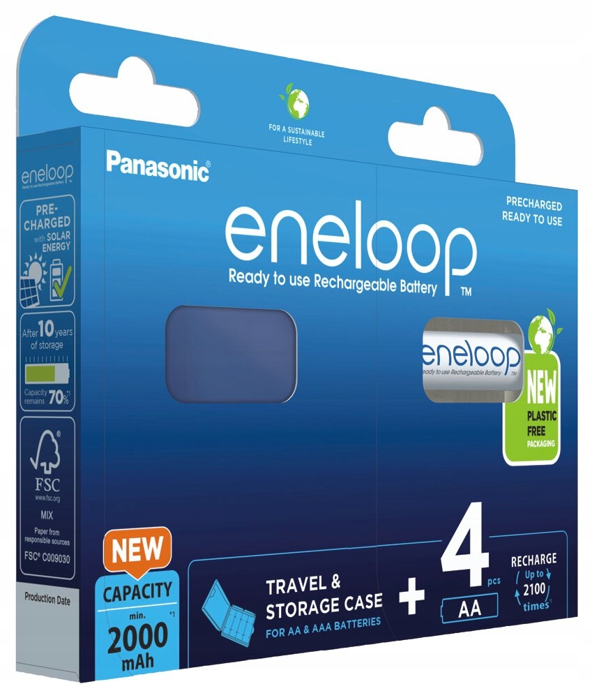 Акумулятори Panasonic Eneloop R6 AA з мінімальною ємністю 2000 мАг, упаковані по 4 шт. Нова вдосконалена версія BK-3MCDE. Батареї дозволяють до 2100 циклів заряджання, що робить їх екологічним вибором порівняно з одноразовими батареями. Вони зберігають до 70% енергії протягом 10 років після зарядки. Вони дозволяють працювати навіть до -20 градусів. C
