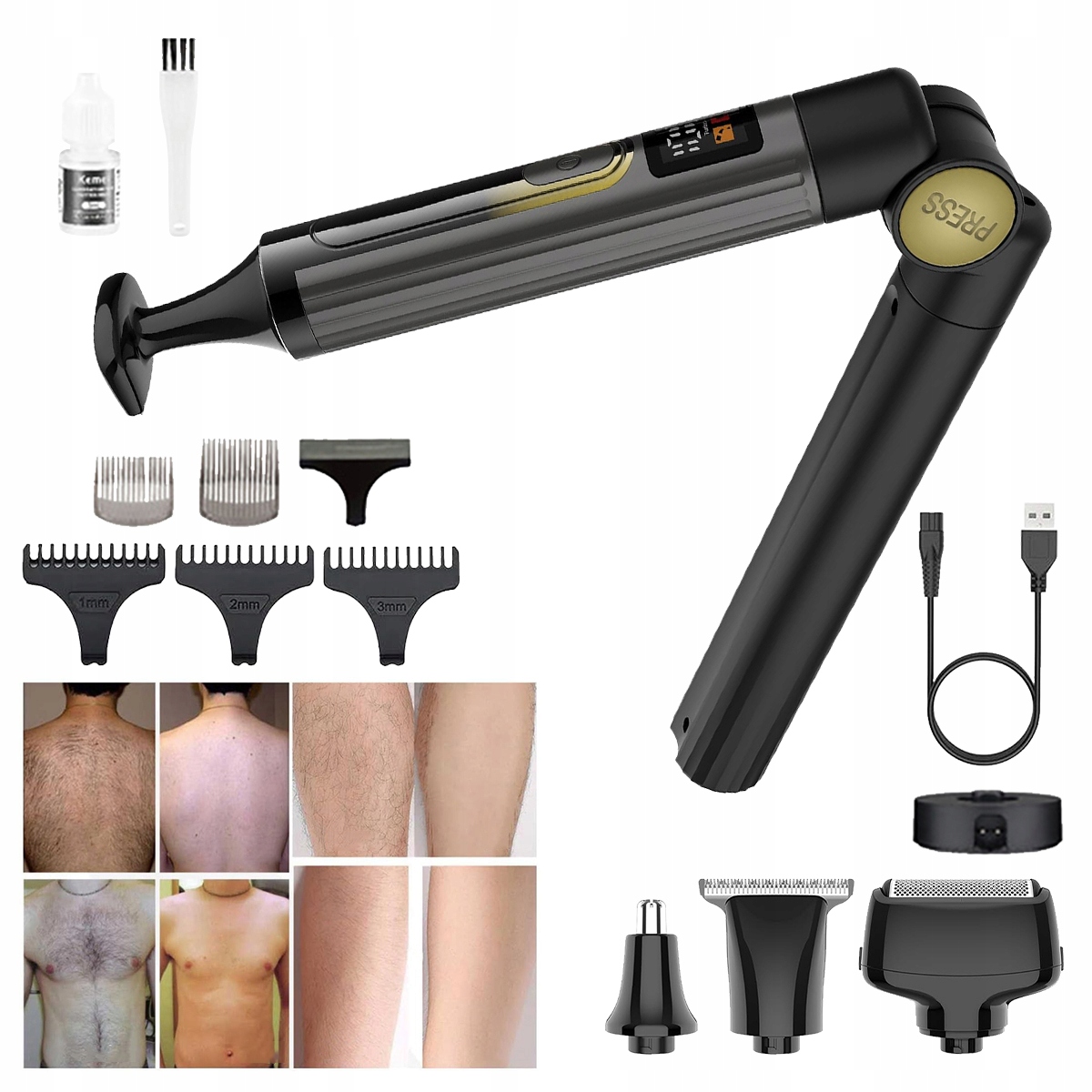 містить 4 знімних голов: точний тример, тример для носа, тример для тіла та основна бритва до спини. Оснащений 5 свинцевим боєм: 1/2/3 мм для точного обрізки, для обрізання волосся, обрізки бороди та баків з точністю; 3 мм/6 мм тример для тіла для гоління спини, рук, ніг і всього тіла. Цей набір призначений не лише для обрізки волосся на обличчі, але і для догляду за волоссям нижче талії і підходить для щоденних потреб чоловіків.