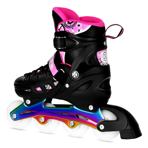 ✨Роликові ковзани NH10905 — це справжнє задоволення від катання. Завдяки можливості переміщення додаткового колеса на задню вісь, роликовий ковзан функціонально перетворюється на роликовий ковзан. Таке рішення допоможе самим маленьким фігуристам зробити перші кроки в цьому виді спорту. У свою чергу, установка додаткового колеса на передню вісь перетворює виріб на роликовий ковзан. Ролер оснащений спеціальними алюмінієвими райдужними ковзанами, які не тільки покращують естетику, але й збільшують довговічність і стійкість конструкції. Використовувані гальма забезпечують безпеку під час катання, а колеса та підшипники класу ABEC7 дозволяють знизити опір коченню, тобто швидше кататися.✨