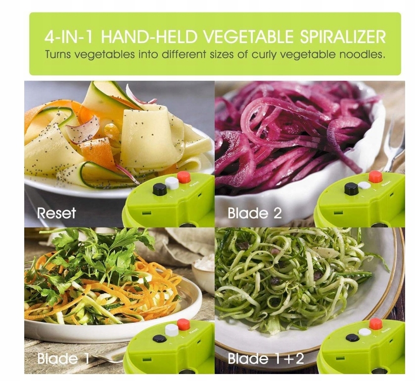 Замініть звичайні овочі привабливими, здоровими стравами завдяки цьому зручному спіралізатору 4in1! Ідеально підходить для приготування овочевих макаронних виробів, салатів або прикрас для страв.