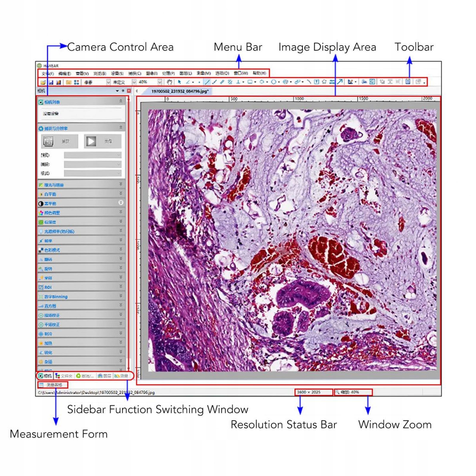 5. Більше можливостей: додавання шарів, водяних знаків, мозаїки, плиток; Налаштуйте колірний баланс, експозицію, насиченість, контраст і напрямок; Зміна роздільної здатності, гістограма, зернистість, дифузія; Трансформуйте зображення за допомогою визначення країв і спотворення цифрового зображення; Вимірювання окремих, паралельних або вертикальних ліній, а також прямокутних, еліптичних і неправильних площ; Додайте анотації, розміри, текст, стрілки, мітки тощо, використовуючи спеціальний текст різних розмірів і кольорів; Виконуйте вимірювання в мікрометрах, міліметрах, сантиметрах, дюймах, футах тощо за будь-якого збільшення з необхідним допуском.